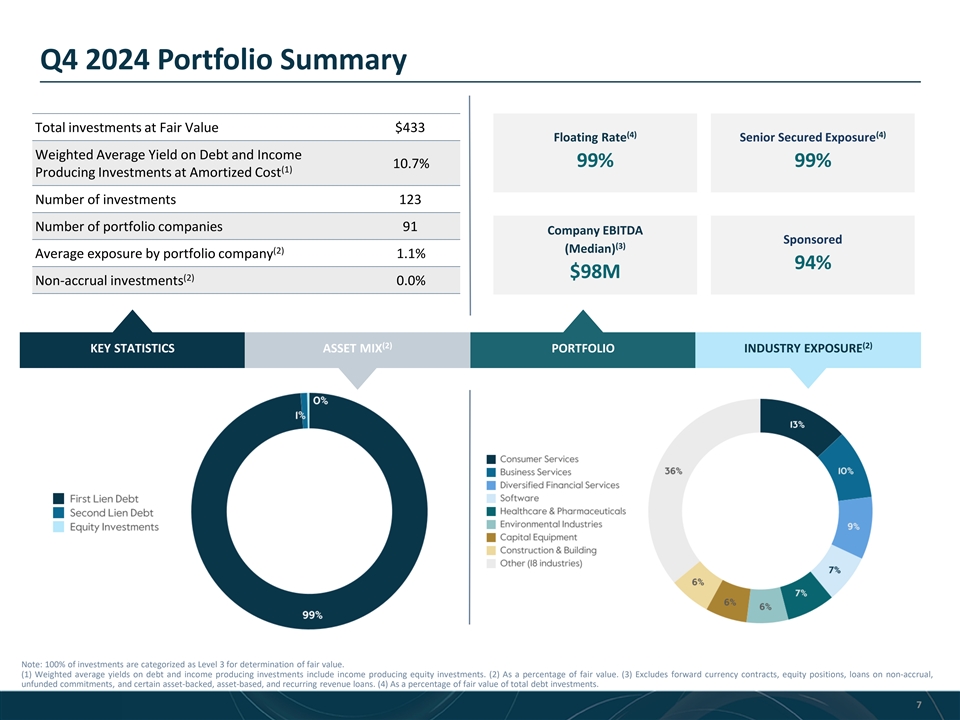 Q4 2024 Quarterly Results • For the year ended December 31, 2024, NAV per share was $20.76 • For the three months ended December 31, 2024, NII per Share was $0.59 and Net Income per Share was $0.53 Summary Balance Sheet Q3 2024 Q4 2024 ASSETS Total investments, at fair value $ 385,594 $ 433,208 Cash, cash equivalents and restricted cash 18,397 30,831 Prepaid expenses and other assets 8,451 9,726 Total Assets $ 412,442 $ 473,765 LIABILITIES & NET ASSETS Debt and secured borrowings $ 151,000 $ 191,000 Other accrued expenses and liabilities 15,979 13,800 Total Liabilities $ 166,979 $ 204,800 Net Assets $ 245,463 $ 268,965 Shares outstanding at end of period 11,709,773 12,958,484 Net Asset Value Per Share $ 20.96 $ 20.76 Summary Income Statement Q4 2024 FY 2024 $ Total Investment Income 13,10 $ 48,654 4 Total Expenses 5,992 22,809 Less waivers and reimbursements of expenses (475) (2,291) Net Investment Income $ 7,587 $ 28,136 Net realized and change in unrealized gains (losses) (792) (2,251) Net Income (Loss) $ 6,795 $ 25,885 Net Investment Income per Share $ 0.59 $ 2.48 Net Income (Loss) per Share $ 0.53 $ 2.28 6