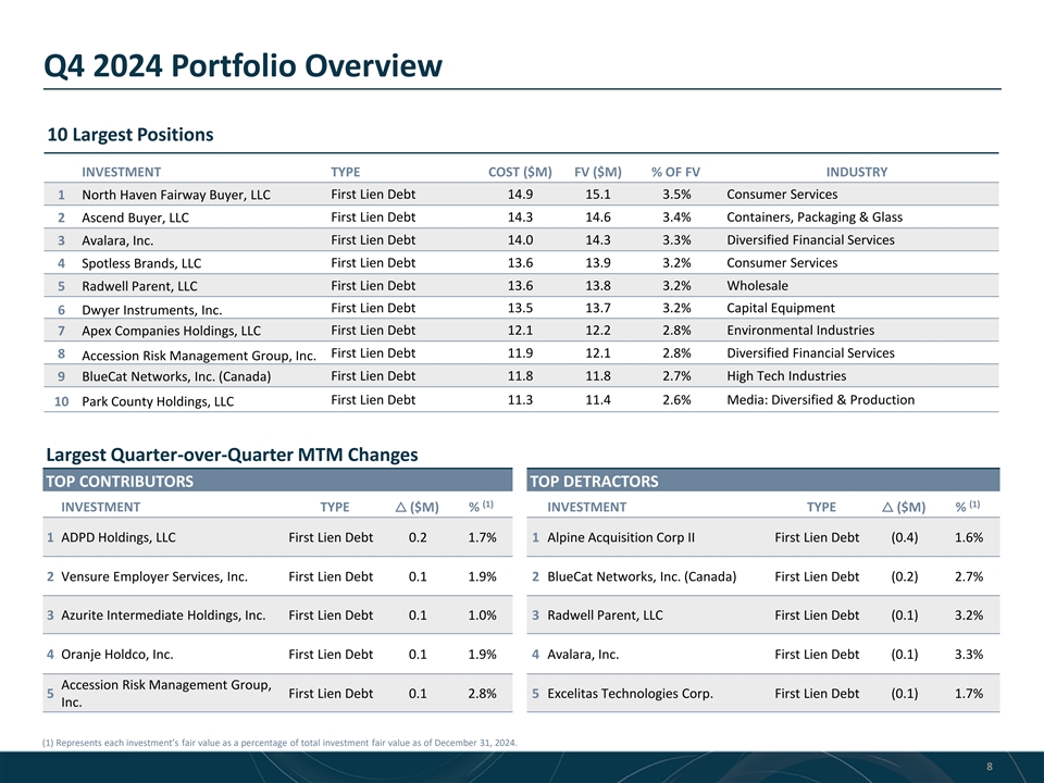 Q4 2024 Portfolio Summary Total investments at Fair Value $433 (4) (4) Floating Rate Senior Secured Exposure Weighted Average Yield on Debt and Income 99% 99% 10.7% (1) Producing Investments at Amortized Cost Number of investments 123 Number of portfolio companies 91 Company EBITDA Sponsored (3) (2) (Median) Average exposure by portfolio company 1.1% 94% $98M (2) Non-accrual investments 0.0% (2) (2) KEY STATISTICS ASSET MIX PORTFOLIO INDUSTRY EXPOSURE Note: 100% of investments are categorized as Level 3 for determination of fair value. (1) Weighted average yields on debt and income producing investments include income producing equity investments. (2) As a percentage of fair value. (3) Excludes forward currency contracts, equity positions, loans on non-accrual, unfunded commitments, and certain asset-backed, asset-based, and recurring revenue loans. (4) As a percentage of fair value of total debt investments. 7