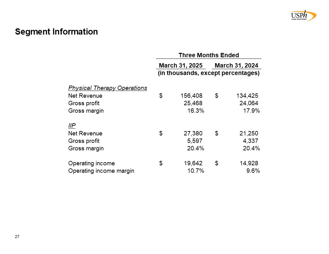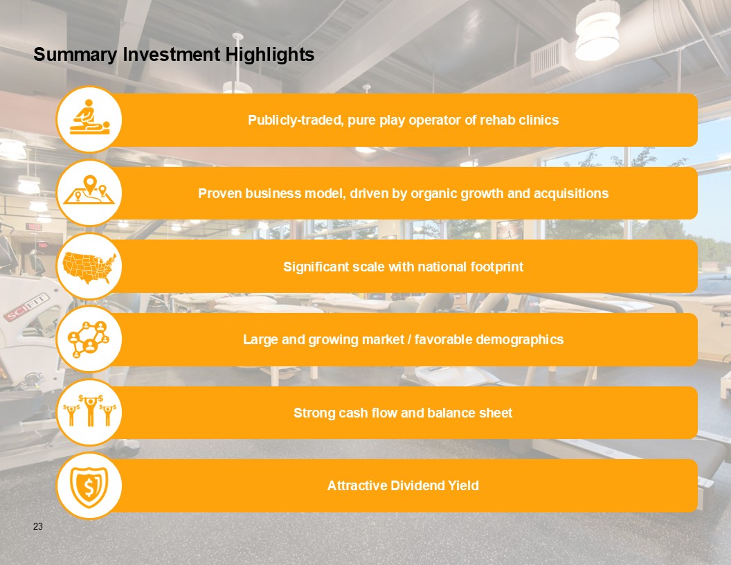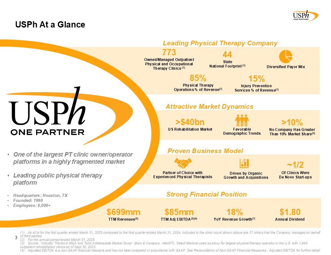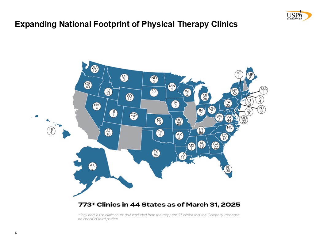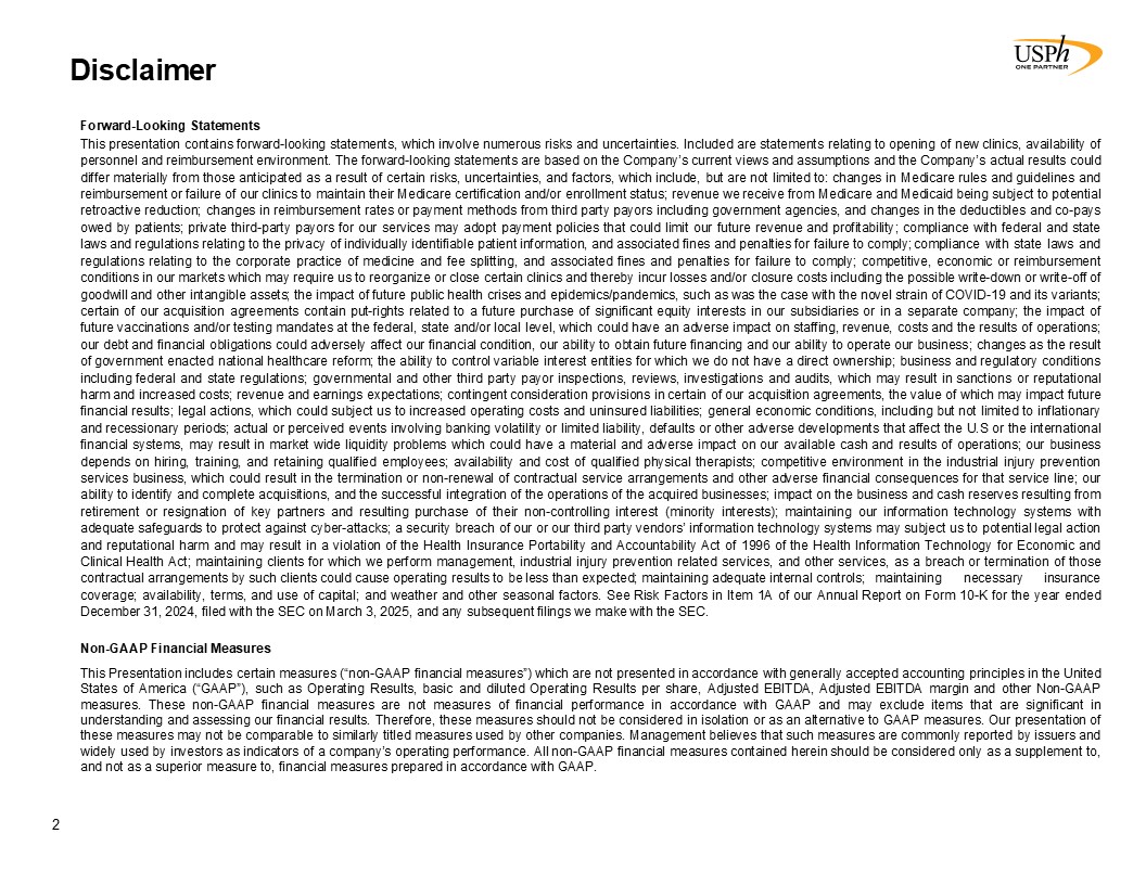 Disclaimer 2 Forward-Looking Statements This presentation contains forward-looking statements, which involve numerous risks and uncertainties. Included are statements relating to opening of new clinics, availability of personnel and reimbursement environment. The forward-looking statements are based on the Company’s current views and assumptions and the Company’s actual results could differ materially from those anticipated as a result of certain risks, uncertainties, and factors, which include, but are not limited to: changes in Medicare rules and guidelines and reimbursement or failure of our clinics to maintain their Medicare certification and/or enrollment status; revenue we receive from Medicare and Medicaid being subject to potential retroactive reduction; changes in reimbursement rates or payment methods from third party payors including government agencies, and changes in the deductibles and co-pays owed by patients; private third-party payors for our services may adopt payment policies that could limit our future revenue and profitability; compliance with federal and state laws and regulations relating to the privacy of individually identifiable patient information, and associated fines and penalties for failure to comply; compliance with state laws and regulations relating to the corporate practice of medicine and fee splitting, and associated fines and penalties for failure to comply; competitive, economic or reimbursement conditions in our markets which may require us to reorganize or close certain clinics and thereby incur losses and/or closure costs including the possible write-down or write-off of goodwill and other intangible assets; the impact of future public health crises and epidemics/pandemics, such as was the case with the novel strain of COVID-19 and its variants; certain of our acquisition agreements contain put-rights related to a future purchase of significant equity interests in our subsidiaries or in a separate company; the impact of future vaccinations and/or testing mandates at the federal, state and/or local level, which could have an adverse impact on staffing, revenue, costs and the results of operations; our debt and financial obligations could adversely affect our financial condition, our ability to obtain future financing and our ability to operate our business; changes as the result of government enacted national healthcare reform; the ability to control variable interest entities for which we do not have a direct ownership; business and regulatory conditions including federal and state regulations; governmental and other third party payor inspections, reviews, investigations and audits, which may result in sanctions or reputational harm and increased costs; revenue and earnings expectations; contingent consideration provisions in certain of our acquisition agreements, the value of which may impact future financial results; legal actions, which could subject us to increased operating costs and uninsured liabilities; general economic conditions, including but not limited to inflationary and recessionary periods; actual or perceived events involving banking volatility or limited liability, defaults or other adverse developments that affect the U.S or the international financial systems, may result in market wide liquidity problems which could have a material and adverse impact on our available cash and results of operations; our business depends on hiring, training, and retaining qualified employees; availability and cost of qualified physical therapists; competitive environment in the industrial injury prevention services business, which could result in the termination or non-renewal of contractual service arrangements and other adverse financial consequences for that service line; our ability to identify and complete acquisitions, and the successful integration of the operations of the acquired businesses; impact on the business and cash reserves resulting from retirement or resignation of key partners and resulting purchase of their non-controlling interest (minority interests); maintaining our information technology systems with adequate safeguards to protect against cyber-attacks; a security breach of our or our third party vendors’ information technology systems may subject us to potential legal action and reputational harm and may result in a violation of the Health Insurance Portability and Accountability Act of 1996 of the Health Information Technology for Economic and Clinical Health Act; maintaining clients for which we perform management, industrial injury prevention related services, and other services, as a breach or termination of those contractual arrangements by such clients could cause operating results to be less than expected; maintaining adequate internal controls; maintaining necessary insurance coverage; availability, terms, and use of capital; and weather and other seasonal factors. See Risk Factors in Item 1A of our Annual Report on Form 10-K for the year ended December 31, 2024, filed with the SEC on March 3, 2025, and any subsequent filings we make with the SEC. Non-GAAP Financial Measures This Presentation includes certain measures (“non-GAAP financial measures”) which are not presented in accordance with generally accepted accounting principles in the United States of America (“GAAP”), such as Operating Results, basic and diluted Operating Results per share, Adjusted EBITDA, Adjusted EBITDA margin and other Non-GAAP measures. These non-GAAP financial measures are not measures of financial performance in accordance with GAAP and may exclude items that are significant in understanding and assessing our financial results. Therefore, these measures should not be considered in isolation or as an alternative to GAAP measures. Our presentation of these measures may not be comparable to similarly titled measures used by other companies. Management believes that such measures are commonly reported by issuers and widely 