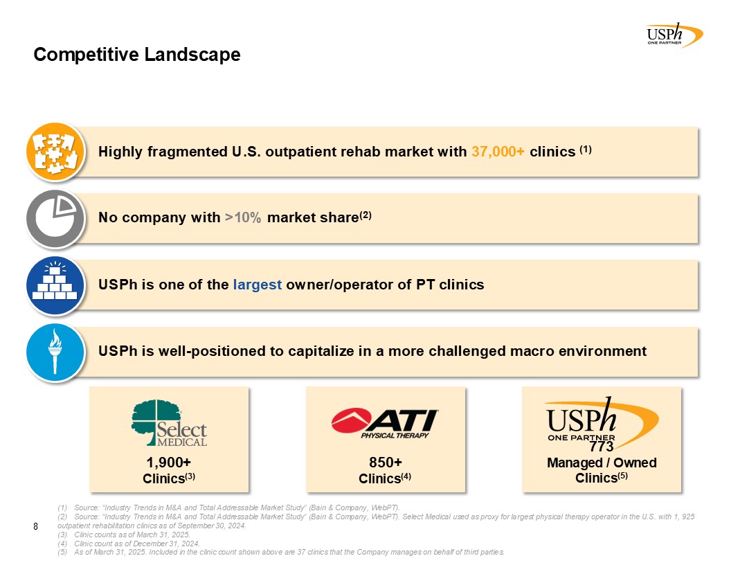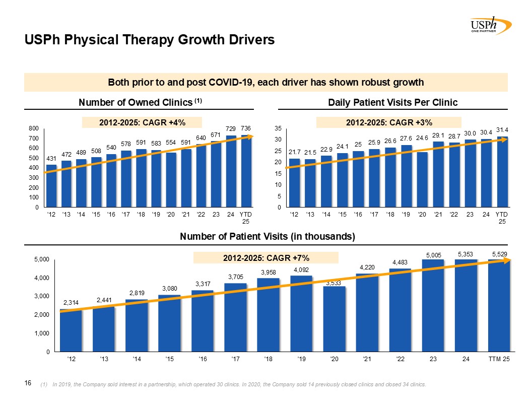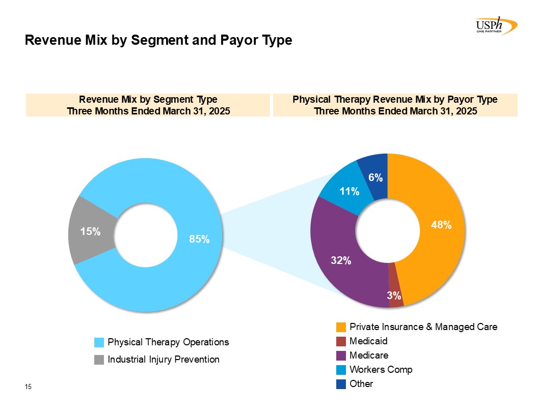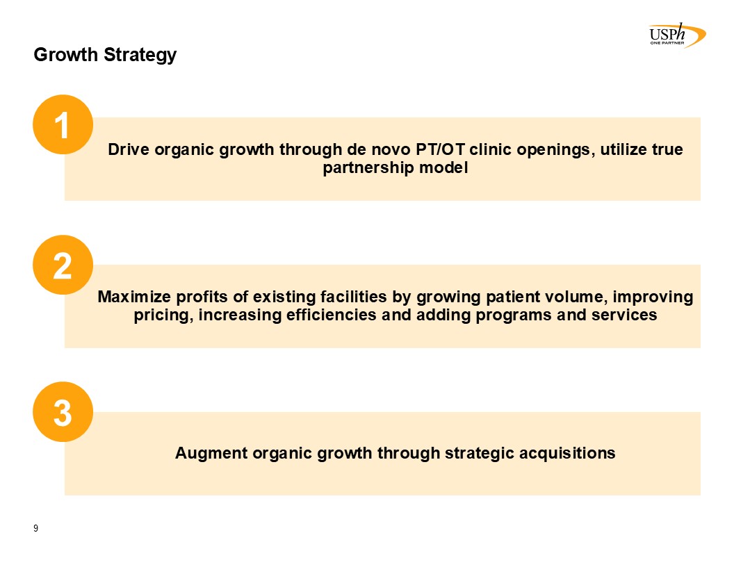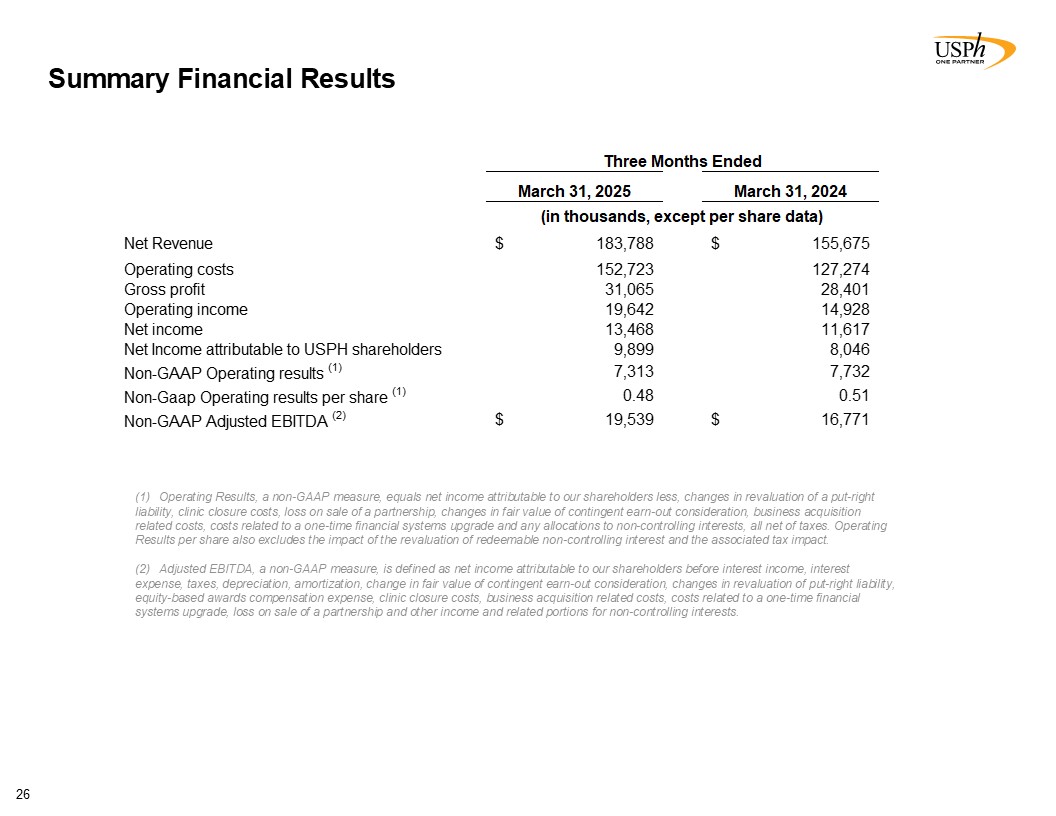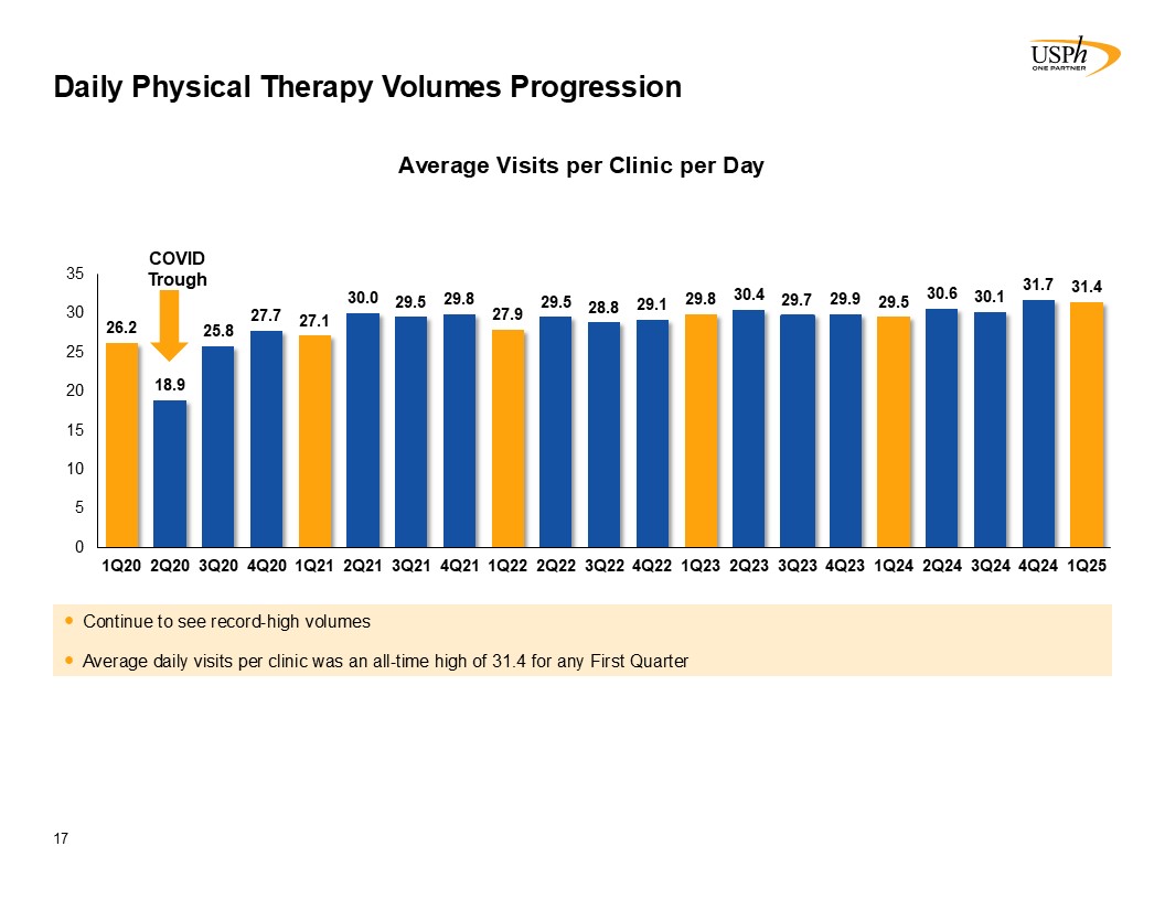 Disclaimer 2 Forward-Looking Statements This presentation contains forward-looking statements, which involve numerous risks and uncertainties. Included are statements relating to opening of new clinics, availability of personnel and reimbursement environment. The forward-looking statements are based on the Company’s current views and assumptions and the Company’s actual results could differ materially from those anticipated as a result of certain risks, uncertainties, and factors, which include, but are not limited to: changes in Medicare rules and guidelines and reimbursement or failure of our clinics to maintain their Medicare certification and/or enrollment status; revenue we receive from Medicare and Medicaid being subject to potential retroactive reduction; changes in reimbursement rates or payment methods from third party payors including government agencies, and changes in the deductibles and co-pays owed by patients; private third-party payors for our services may adopt payment policies that could limit our future revenue and profitability; compliance with federal and state laws and regulations relating to the privacy of individually identifiable patient information, and associated fines and penalties for failure to comply; compliance with state laws and regulations relating to the corporate practice of medicine and fee splitting, and associated fines and penalties for failure to comply; competitive, economic or reimbursement conditions in our markets which may require us to reorganize or close certain clinics and thereby incur losses and/or closure costs including the possible write-down or write-off of goodwill and other intangible assets; the impact of future public health crises and epidemics/pandemics, such as was the case with the novel strain of COVID-19 and its variants; certain of our acquisition agreements contain put-rights related to a future purchase of significant equity interests in our subsidiaries or in a separate company; the impact of future vaccinations and/or testing mandates at the federal, state and/or local level, which could have an adverse impact on staffing, revenue, costs and the results of operations; our debt and financial obligations could adversely affect our financial condition, our ability to obtain future financing and our ability to operate our business; changes as the result of government enacted national healthcare reform; the ability to control variable interest entities for which we do not have a direct ownership; business and regulatory conditions including federal and state regulations; governmental and other third party payor inspections, reviews, investigations and audits, which may result in sanctions or reputational harm and increased costs; revenue and earnings expectations; contingent consideration provisions in certain of our acquisition agreements, the value of which may impact future financial results; legal actions, which could subject us to increased operating costs and uninsured liabilities; general economic conditions, including but not limited to inflationary and recessionary periods; actual or perceived events involving banking volatility or limited liability, defaults or other adverse developments that affect the U.S or the international financial systems, may result in market wide liquidity problems which could have a material and adverse impact on our available cash and results of operations; our business depends on hiring, training, and retaining qualified employees; availability and cost of qualified physical therapists; competitive environment in the industrial injury prevention services business, which could result in the termination or non-renewal of contractual service arrangements and other adverse financial consequences for that service line; our ability to identify and complete acquisitions, and the successful integration of the operations of the acquired businesses; impact on the business and cash reserves resulting from retirement or resignation of key partners and resulting purchase of their non-controlling interest (minority interests); maintaining our information technology systems with adequate safeguards to protect against cyber-attacks; a security breach of our or our third party vendors’ information technology systems may subject us to potential legal action and reputational harm and may result in a violation of the Health Insurance Portability and Accountability Act of 1996 of the Health Information Technology for Economic and Clinical Health Act; maintaining clients for which we perform management, industrial injury prevention related services, and other services, as a breach or termination of those contractual arrangements by such clients could cause operating results to be less than expected; maintaining adequate internal controls; maintaining necessary insurance coverage; availability, terms, and use of capital; and weather and other seasonal factors. See Risk Factors in Item 1A of our Annual Report on Form 10-K for the year ended December 31, 2024, filed with the SEC on March 3, 2025, and any subsequent filings we make with the SEC. Non-GAAP Financial Measures This Presentation includes certain measures (“non-GAAP financial measures”) which are not presented in accordance with generally accepted accounting principles in the United States of America (“GAAP”), such as Operating Results, basic and diluted Operating Results per share, Adjusted EBITDA, Adjusted EBITDA margin and other Non-GAAP measures. These non-GAAP financial measures are not measures of financial performance in accordance with GAAP and may exclude items that are significant in understanding and assessing our financial results. Therefore, these measures should not be considered in isolation or as an alternative to GAAP measures. Our presentation of these measures may not be comparable to similarly titled measures used by other companies. Management believes that such measures are commonly reported by issuers and widely 