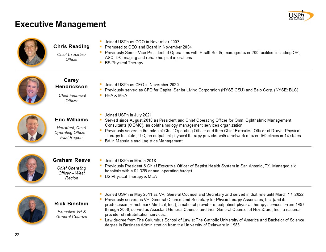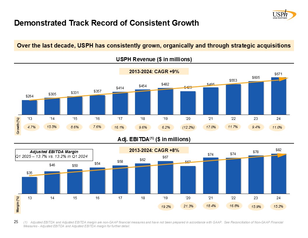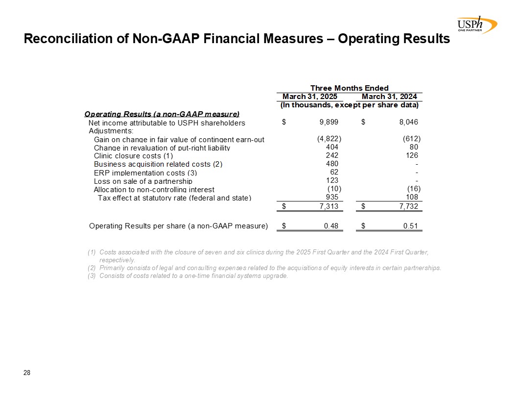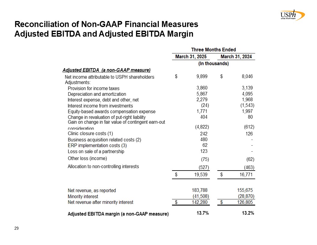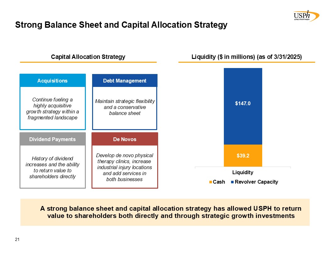 Disclaimer 2 Forward-Looking Statements This presentation contains forward-looking statements, which involve numerous risks and uncertainties. Included are statements relating to opening of new clinics, availability of personnel and reimbursement environment. The forward-looking statements are based on the Company’s current views and assumptions and the Company’s actual results could differ materially from those anticipated as a result of certain risks, uncertainties, and factors, which include, but are not limited to: changes in Medicare rules and guidelines and reimbursement or failure of our clinics to maintain their Medicare certification and/or enrollment status; revenue we receive from Medicare and Medicaid being subject to potential retroactive reduction; changes in reimbursement rates or payment methods from third party payors including government agencies, and changes in the deductibles and co-pays owed by patients; private third-party payors for our services may adopt payment policies that could limit our future revenue and profitability; compliance with federal and state laws and regulations relating to the privacy of individually identifiable patient information, and associated fines and penalties for failure to comply; compliance with state laws and regulations relating to the corporate practice of medicine and fee splitting, and associated fines and penalties for failure to comply; competitive, economic or reimbursement conditions in our markets which may require us to reorganize or close certain clinics and thereby incur losses and/or closure costs including the possible write-down or write-off of goodwill and other intangible assets; the impact of future public health crises and epidemics/pandemics, such as was the case with the novel strain of COVID-19 and its variants; certain of our acquisition agreements contain put-rights related to a future purchase of significant equity interests in our subsidiaries or in a separate company; the impact of future vaccinations and/or testing mandates at the federal, state and/or local level, which could have an adverse impact on staffing, revenue, costs and the results of operations; our debt and financial obligations could adversely affect our financial condition, our ability to obtain future financing and our ability to operate our business; changes as the result of government enacted national healthcare reform; the ability to control variable interest entities for which we do not have a direct ownership; business and regulatory conditions including federal and state regulations; governmental and other third party payor inspections, reviews, investigations and audits, which may result in sanctions or reputational harm and increased costs; revenue and earnings expectations; contingent consideration provisions in certain of our acquisition agreements, the value of which may impact future financial results; legal actions, which could subject us to increased operating costs and uninsured liabilities; general economic conditions, including but not limited to inflationary and recessionary periods; actual or perceived events involving banking volatility or limited liability, defaults or other adverse developments that affect the U.S or the international financial systems, may result in market wide liquidity problems which could have a material and adverse impact on our available cash and results of operations; our business depends on hiring, training, and retaining qualified employees; availability and cost of qualified physical therapists; competitive environment in the industrial injury prevention services business, which could result in the termination or non-renewal of contractual service arrangements and other adverse financial consequences for that service line; our ability to identify and complete acquisitions, and the successful integration of the operations of the acquired businesses; impact on the business and cash reserves resulting from retirement or resignation of key partners and resulting purchase of their non-controlling interest (minority interests); maintaining our information technology systems with adequate safeguards to protect against cyber-attacks; a security breach of our or our third party vendors’ information technology systems may subject us to potential legal action and reputational harm and may result in a violation of the Health Insurance Portability and Accountability Act of 1996 of the Health Information Technology for Economic and Clinical Health Act; maintaining clients for which we perform management, industrial injury prevention related services, and other services, as a breach or termination of those contractual arrangements by such clients could cause operating results to be less than expected; maintaining adequate internal controls; maintaining necessary insurance coverage; availability, terms, and use of capital; and weather and other seasonal factors. See Risk Factors in Item 1A of our Annual Report on Form 10-K for the year ended December 31, 2024, filed with the SEC on March 3, 2025, and any subsequent filings we make with the SEC. Non-GAAP Financial Measures This Presentation includes certain measures (“non-GAAP financial measures”) which are not presented in accordance with generally accepted accounting principles in the United States of America (“GAAP”), such as Operating Results, basic and diluted Operating Results per share, Adjusted EBITDA, Adjusted EBITDA margin and other Non-GAAP measures. These non-GAAP financial measures are not measures of financial performance in accordance with GAAP and may exclude items that are significant in understanding and assessing our financial results. Therefore, these measures should not be considered in isolation or as an alternative to GAAP measures. Our presentation of these measures may not be comparable to similarly titled measures used by other companies. Management believes that such measures are commonly reported by issuers and widely 
