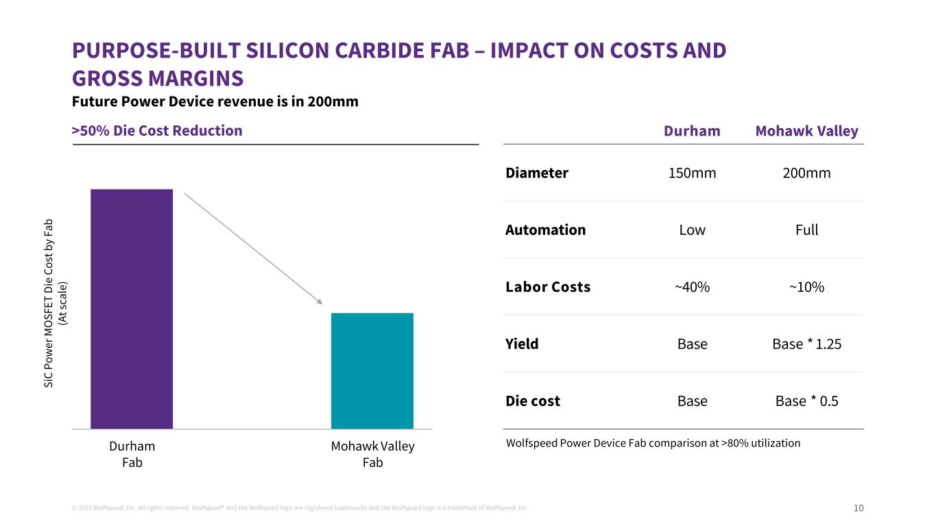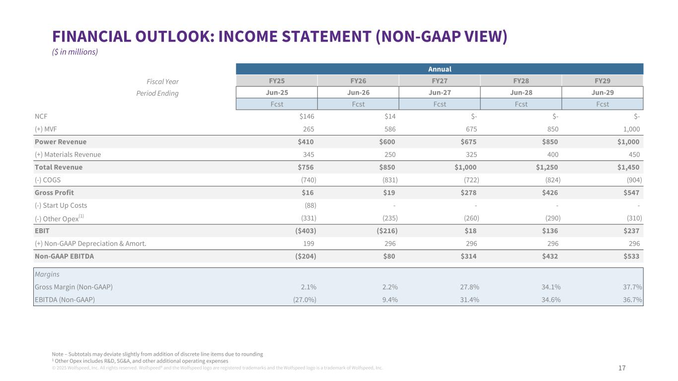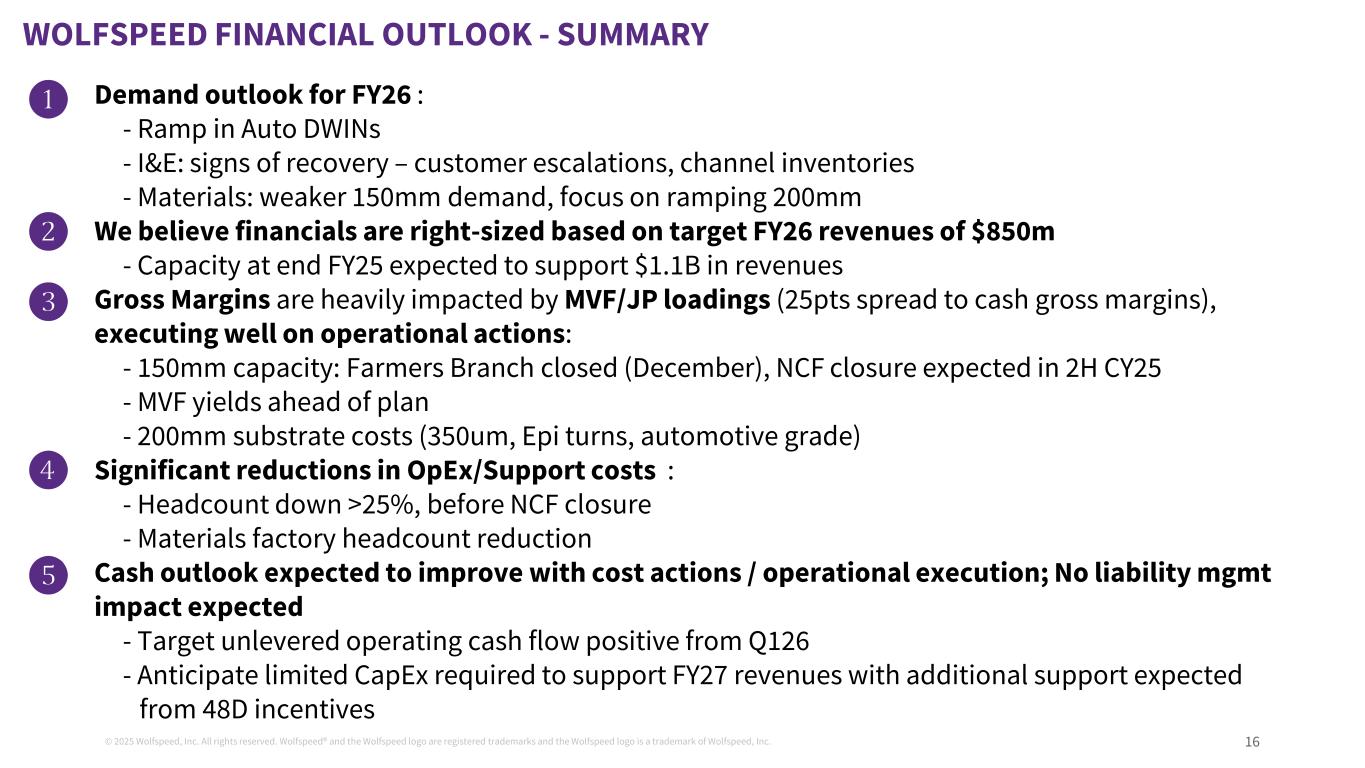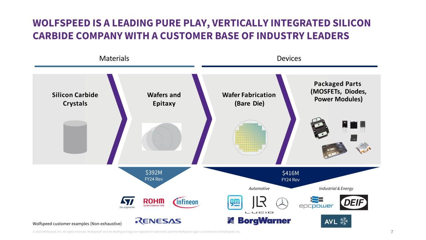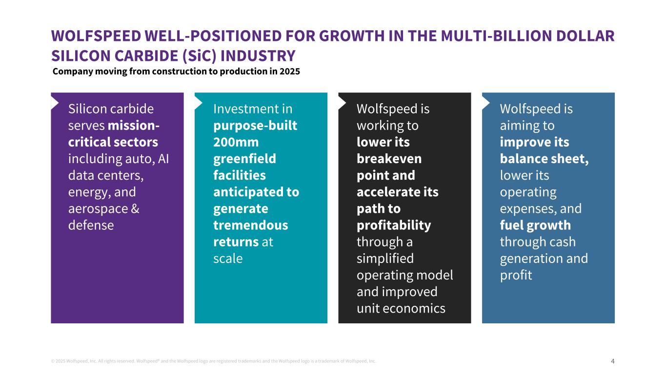 © 2025 Wolfspeed, Inc. All rights reserved. Wolfspeed® and the Wolfspeed logo are registered trademarks and the Wolfspeed logo is a trademark of Wolfspeed, Inc. 2 FORWARD LOOKING STATEMENTS AND NON-GAAP MEASURES a Confidential The information contained herein is strictly confidential. The recipient should become familiar with the confidentiality obligations to which the recipient is subject whether pursuant to any confidentiality agreement or otherwise. Note on Forward Looking Statements This presentation includes forward looking statements about Wolfspeed, Inc.’s (“Wolfspeed”) business and financial outlook, future targets, product markets, plans and objectives for future operations, and product development programs and goals. These statements are subject to risks and uncertainties, both known and unknown, that may cause actual results to differ materially, as discussed in our most recent annual report and other reports filed with the U.S. Securities and Exchange Commission (“SEC”). Forward-looking statements by their nature address matters that are, to different degrees, uncertain, such as statements about our plans to grow the business, our ability to achieve our financial targets and goals, our ability to meet targeted utilization rates and accelerate the shift of our device fabrication to the Mohawk Valley Fab, our revenue and market growth, and our ability to reduce costs, optimize our capital structure and access funding. Actual results could differ materially due to a number of factors, including but not limited to, ongoing uncertainty in global economic and geopolitical conditions, such as the ongoing military conflict between Russia and Ukraine and the ongoing conflicts in the Middle East, changes in progress on infrastructure development or changes in customer or industrial demand that could negatively affect product demand, including as a result of an economic slowdown or recession, collectability of receivables and other related matters if consumers and businesses defer purchases or payments, or default on payments; risks associated with our expansion plans, including design and construction delays, cost overruns, the timing and amount of government incentives actually received, including, among other things, any direct grants and tax credits under the CHIPS Act, issues in installing and qualifying new equipment and ramping production, poor production process yields and quality control, and potential increases to our restructuring costs; our ability to obtain additional funding, including, among other things, from government funding, public or private equity offerings, or debt financings, on favorable terms and on a timely basis, if at all; our ability to take certain actions with respect to our capital and debt structure, including issuing the full amount of senior notes under our agreements with our lenders and restructuring or refinancing our convertible notes; the risk that we do not meet our production commitments to those customers who provide us with capacity reservation deposits or similar payments; the risk that we may experience production difficulties that preclude us from shipping sufficient quantities to meet customer orders or that result in higher production costs, lower yields and lower margins; our ability to lower costs; the risk that our results will suffer if we are unable to balance fluctuations in customer demand and capacity, including bringing on additional capacity on a timely basis to meet customer demand or scaling back our manufacturing expenses or overhead costs quickly enough to correspond to lower than expected demand; the risk that longer manufacturing lead times may cause customers to fulfill their orders with a competitor's products instead; product mix; risks associated with the ramp-up of production of our new products, and our entry into new business channels different from those in which we have historically operated; our ability to convert customer design-ins to design-wins and sales of significant volume, and, if customer design-in activity does result in such sales, when such sales will ultimately occur and what the amount of such sales will be; the risk that the markets for our products will not develop as we expect, including the adoption of our products by electric vehicle manufacturers and the overall adoption of electric vehicles; the risk that the economic and political uncertainty caused by the tariffs imposed by the United States on Chinese goods, and corresponding Chinese tariffs and currency devaluation in response, may continue to negatively impact demand for our products; the risk that we or our channel partners are not able to develop and expand customer bases and accurately anticipate demand from end customers, including production and product mix, which can result in increased inventory and reduced orders as we experience wide fluctuations in supply and demand; risks related to international sales and purchases; risks resulting from the concentration of our business among few customers, including the risk that customers may reduce or cancel orders or fail to honor purchase commitments; the risk that our investments may experience periods of significant market value and interest rate volatility causing us to recognize fair value losses on our investment; the risk posed by managing an increasingly complex supply chain (including managing the impacts of supply constraints in the semiconductor industry and meeting purchase commitments under take-or-pay arrangements with certain suppliers) that has the ability to supply a sufficient quantity of raw materials, subsystems and finished products with the required specifications and quality; risks relating to outbreaks of infectious diseases or similar public health events, including the risk of disruptions to our operations, supply chain, including our contract manufacturers, or customer demand; the risk we may be required to record a significant charge to earnings i