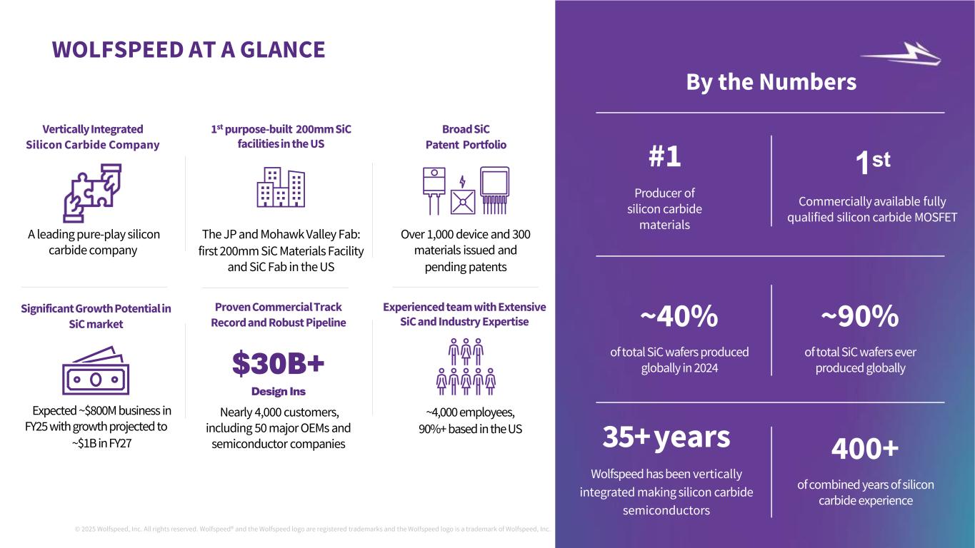 © 2025 Wolfspeed, Inc. All rights reserved. Wolfspeed® and the Wolfspeed logo are registered trademarks and the Wolfspeed logo is a trademark of Wolfspeed, Inc. 35+ years Wolfspeed has been vertically integrated making silicon carbide semiconductors #1 Producer of silicon carbide materials 1st Commercially available fully qualified silicon carbide MOSFET ~40% of total SiC wafers produced globally in 2024 WOLFSPEED AT A GLANCE By the Numbers ~90% of total SiC wafers ever produced globally 400+ of combined years of silicon carbide experience 1st purpose-built 200mm SiC facilities in the US The JP and Mohawk Valley Fab: first 200mm SiC Materials Facility and SiC Fab in the US Expected ~$800M business in FY25 with growth projected to ~$1B in FY27 Significant Growth Potential in SiC market Over 1,000 device and 300 materials issued and pending patents Broad SiC Patent Portfolio ~4,000 employees, 90%+ based in the US Experienced team with Extensive SiC and Industry Expertise A leading pure-play silicon carbide company Vertically Integrated Silicon Carbide Company Nearly 4,000 customers, including 50 major OEMs and semiconductor companies Proven Commercial Track Record and Robust Pipeline $30B+ Design Ins