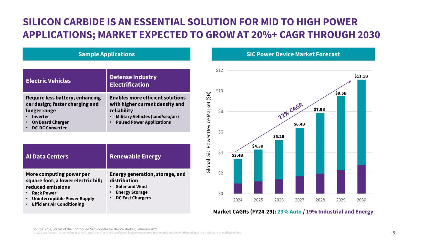 © 2025 Wolfspeed, Inc. All rights reserved. Wolfspeed® and the Wolfspeed logo are registered trademarks and the Wolfspeed logo is a trademark of Wolfspeed, Inc. 8 Electric Vehicles Defense Industry Electrification Require less battery, enhancing car design; faster charging and longer range • Inverter • On Board Charger • DC-DC Converter Enables more efficient solutions with higher current density and reliability • Military Vehicles (land/sea/air) • Pulsed Power Applications AI Data Centers Renewable Energy More computing power per square foot; a lower electric bill; reduced emissions • Rack Power • Uninterruptible Power Supply • Efficient Air Conditioning Energy generation, storage, and distribution • Solar and Wind • Energy Storage • DC Fast Chargers SILICON CARBIDE IS AN ESSENTIAL SOLUTION FOR MID TO HIGH POWER APPLICATIONS; MARKET EXPECTED TO GROW AT 20%+ CAGR THROUGH 2030 Sample Applications $0 $2 $4 $6 $8 $10 $12 2024 2025 2026 2027 2028 2029 2030 Market CAGRs (FY24-29): 23% Auto / 19% Industrial and Energy $3.4B $4.3B $5.2B $6.4B $7.9B $11.1B SiC Power Device Market Forecast Gl ob al S iC P ow er D ev ic e M ar ke t ( $B ) Source: Yole, Status of the Compound Semiconductor Device Market, February 2025 $9.5B
