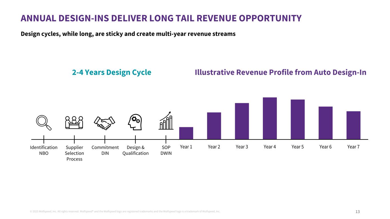 © 2025 Wolfspeed, Inc. All rights reserved. Wolfspeed® and the Wolfspeed logo are registered trademarks and the Wolfspeed logo is a trademark of Wolfspeed, Inc. 22 GLOSSARY OF TERMS Battery Electric Vehicles (BEVs): Battery Electric Vehicles are fully electric vehicles that rely solely on an electric motor powered by a rechargeable battery pack. BEVs do not have an internal combustion engine and produce zero tailpipe emissions, making them an environmentally friendly transportation option. They are charged by plugging into an external power source and are known for their efficiency, quiet operation, and lower operating costs compared to traditional gasoline-powered vehicles. Design-Ins: Design-Ins are customer commitments to purchase our products and are one of the factors we use to forecast long-term demand and future revenue. To meet the qualification of a Design-In, the customer provides us with documentation (e.g., a letter of intent, statement of work or developmental contract) that can include details such as the expected delivery timeline, estimated price, necessary capacity and required support. A design-in, even with a formal commitment, does not always convert to future revenue (a ‘Design-Win') for a variety of reasons, including, but not limited to, the customer delaying or abandoning the project, capacity constraints, timeline challenges, and/or technology changes. Therefore, management uses the Design-In amount as a guide to forecast future demand, but it should not be taken as an absolute indicator of future revenue. Design-Wins: Design-Ins are considered Design-Wins when a customer issues a purchase order for at least 20% of the expected first year revenue. Design-Wins reflect each project's entire commitment at the time this criteria is satisfied and should not be taken as an absolute indicator of future revenue. Depending on timing, certain projects may be reflected within a single period’s Design-In and Design-Win figures. Extended Range Electric Vehicles (EREVs): Extended Range Electric Vehicles are a type of electric vehicle that primarily operates on an electric motor powered by a battery but includes an internal combustion engine (ICE) as a backup generator. The ICE is used to recharge the battery or provide additional power when the battery's charge is low, thereby extending the vehicle's driving range beyond what the battery alone can provide. EREVs offer the benefits of electric driving with the added assurance of extended range for longer trips. Plug-in Hybrid Electric Vehicles (PHEVs): Plug-in Hybrid Electric Vehicles are vehicles that combine a conventional internal combustion engine with an electric motor and a rechargeable battery. PHEVs can be charged by plugging into an external power source and can operate in electric-only mode for a certain distance, reducing fuel consumption and emissions. When the battery is depleted, the vehicle seamlessly switches to hybrid mode, using the internal combustion engine to power the vehicle and recharge the battery. PHEVs offer flexibility and efficiency by allowing drivers to use electric power for shorter trips and gasoline for longer journeys. Tier 1: A Tier 1 supplier in the automotive industry is a company that provides products or components directly to the original equipment manufacturer (OEM). These suppliers are responsible for delivering parts that are ready for assembly into the final vehicle, such as engines, transmissions, or electronic systems. Tier 1 suppliers often work closely with OEMs to develop and integrate advanced technologies and ensure that components meet stringent quality and performance standards.