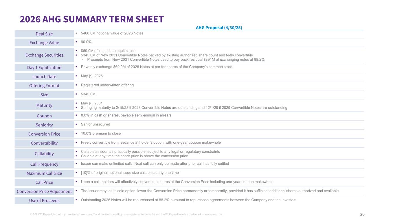 © 2025 Wolfspeed, Inc. All rights reserved. Wolfspeed® and the Wolfspeed logo are registered trademarks and the Wolfspeed logo is a trademark of Wolfspeed, Inc. 20 2026 AHG SUMMARY TERM SHEET AHG Proposal (4/30/25) Deal Size $460.0M notional value of 2026 Notes Exchange Value 90.0% Exchange Securities $69.0M of immediate equitization $345.0M of New 2031 Convertible Notes backed by existing authorized share count and feely convertible - Proceeds from New 2031 Convertible Notes used to buy back residual $391M of exchanging notes at 88.2% Day 1 Equitization Privately exchange $69.0M of 2026 Notes at par for shares of the Company’s common stock Launch Date May [•], 2025 Offering Format Registered underwritten offering Size $345.0M Maturity May [•], 2031 Springing maturity to 2/15/28 if 2028 Convertible Notes are outstanding and 12/1/29 if 2029 Convertible Notes are outstanding Coupon 8.0% in cash or shares, payable semi-annual in arrears Seniority Senior unsecured Conversion Price 10.0% premium to close Convertability Freely convertible from issuance at holder’s option, with one-year coupon makewhole Callability Callable as soon as practically possible, subject to any legal or regulatory constraints Callable at any time the share price is above the conversion price Call Frequency Issuer can make unlimited calls. Next call can only be made after prior call has fully settled Maximum Call Size [10]% of original notional issue size callable at any one time Call Price Upon a call, holders will effectively convert into shares at the Conversion Price including one-year coupon makewhole Conversion Price Adjustment The Issuer may, at its sole option, lower the Conversion Price permanently or temporarily, provided it has sufficient additional shares authorized and available Use of Proceeds Outstanding 2026 Notes will be repurchased at 88.2% pursuant to repurchase agreements between the Company and the investors