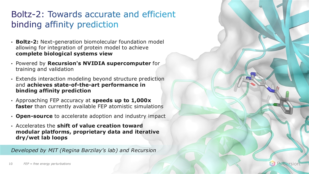 Boltz-2: Towards accurate and efficient binding affinity prediction • Boltz-2: Next-generation biomolecular foundation model allowing for integration of protein model to achieve complete biological systems view • Powered by Recursion's NVIDIA supercomputer for training and validation • Extends interaction modeling beyond structure prediction and achieves state-of-the-art performance in binding affinity prediction • Approaching FEP accuracy at speeds up to 1,000x faster than currently available FEP atomistic simulations • Open-source to accelerate adoption and industry impact • Accelerates the shift of value creation toward modular platforms, proprietary data and iterative dry/wet lab loops Developed by MIT (Regina Barzilay’s lab) and Recursion 10 FEP = free energy perturbations
