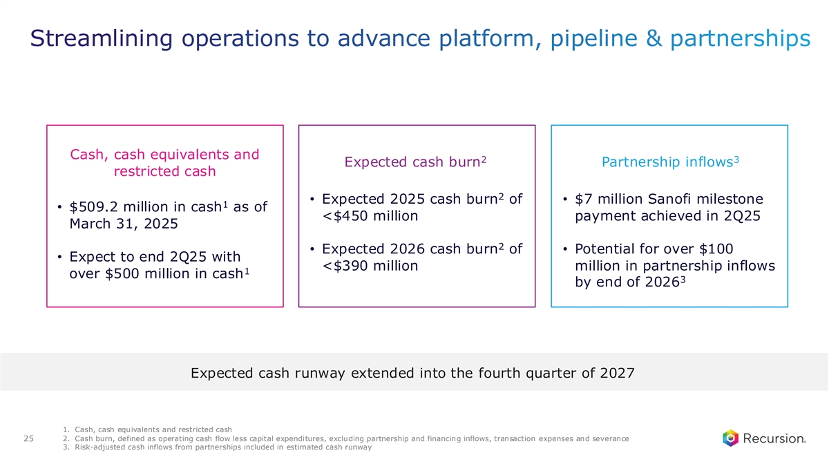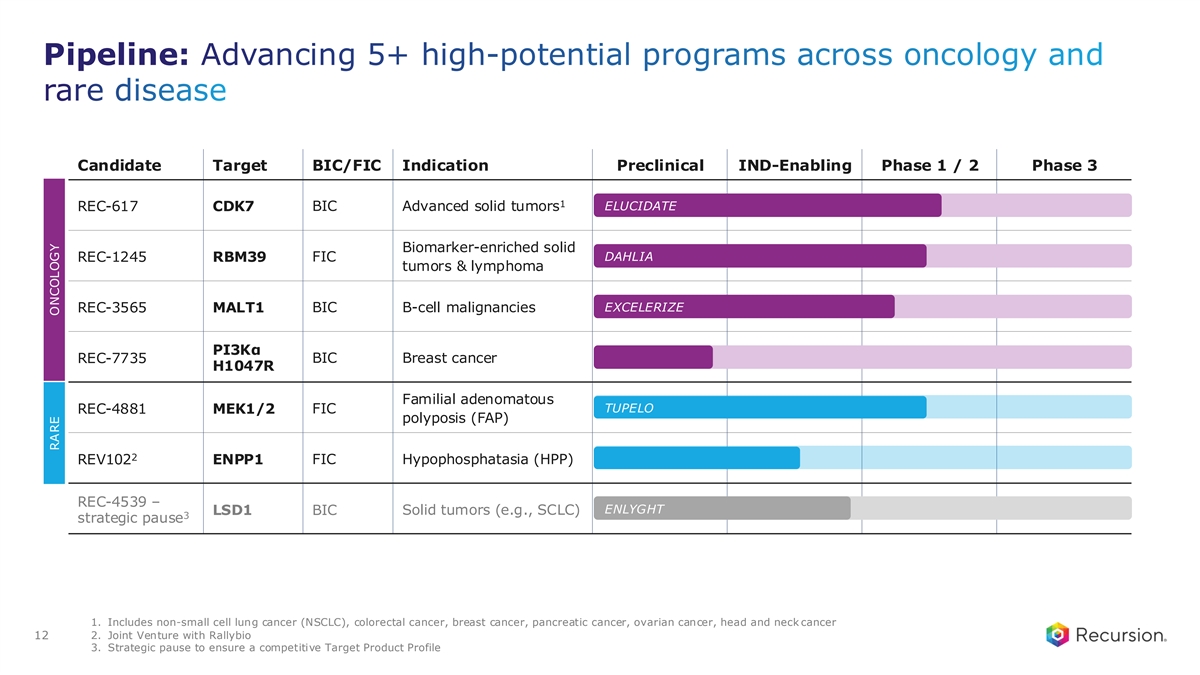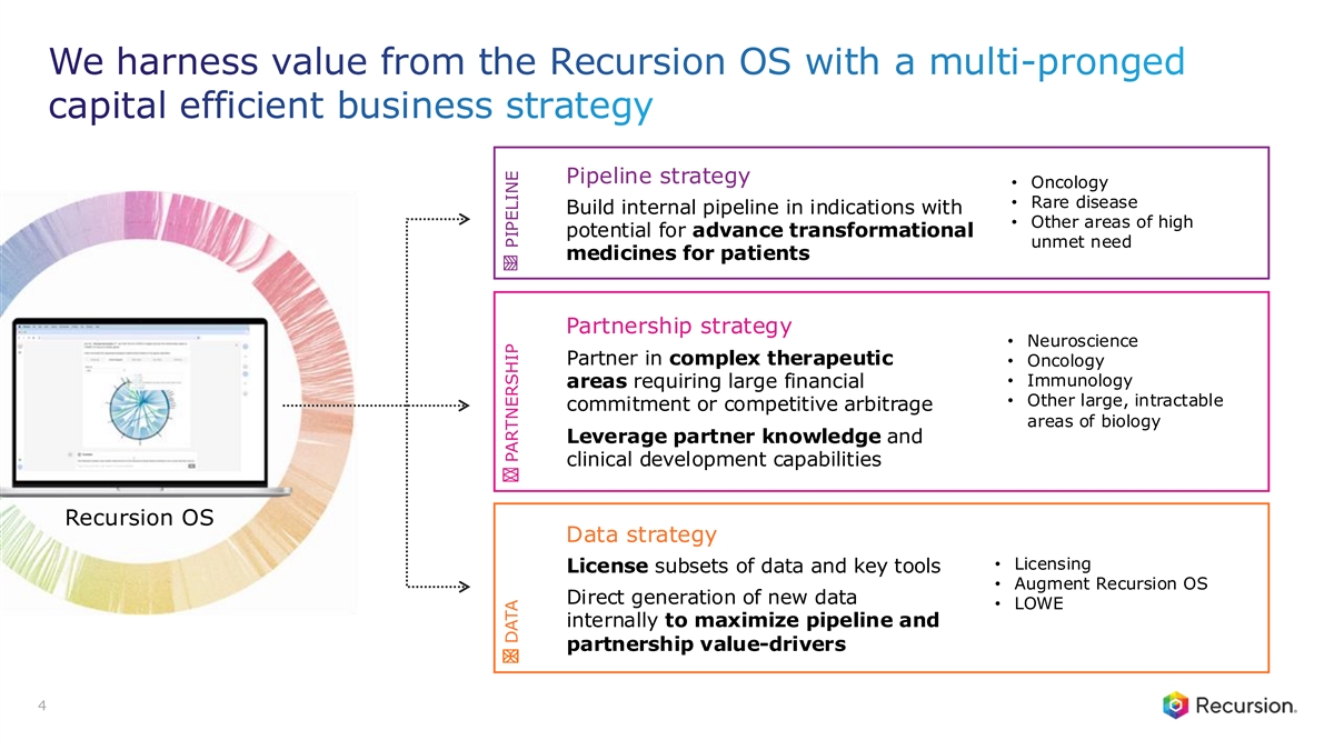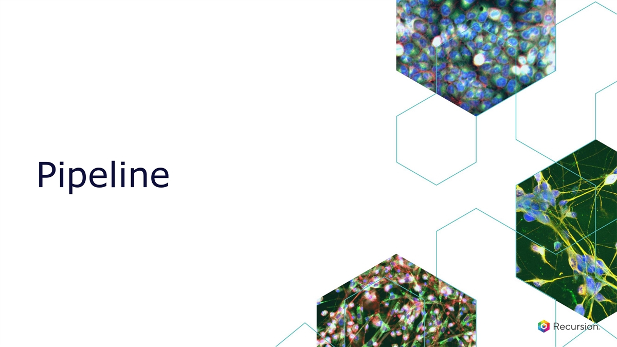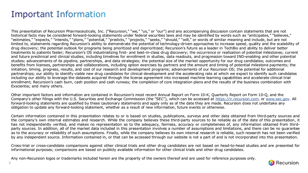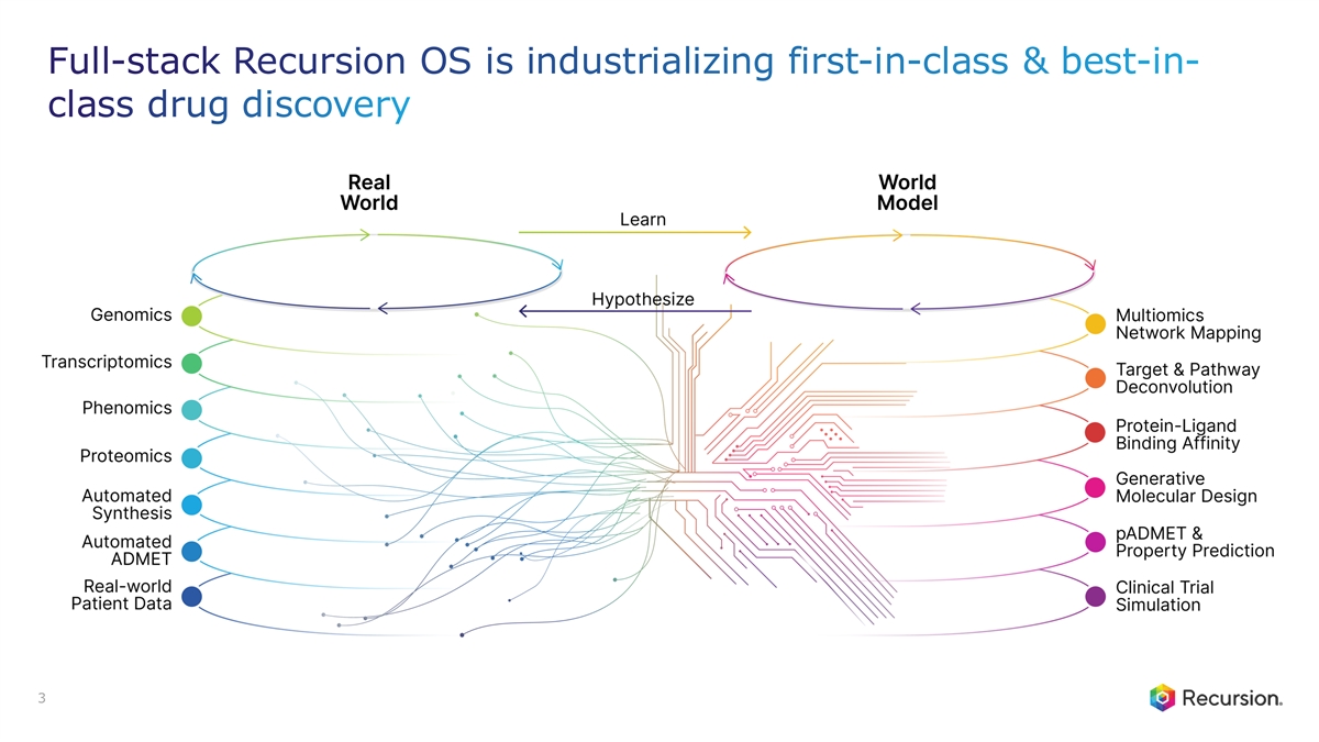 Important Information This presentation of Recursion Pharmaceuticals, Inc. (“Recursion,” “we,” “us,” or “our”) and any accompanying discussion contain statements that are not historical facts may be considered forward-looking statements under federal securities laws and may be identified by words such as “anticipates,” “believes,” “estimates,” “expects,” “intends,” “plans,” “potential,” “predicts,” “projects,” “seeks,” “should,” “will,” or words of similar meaning and include, but are not limited to, statements regarding Recursion’s ability to demonstrate the potential of technology-driven approaches to increase speed, quality and the scalability of drug discovery; the potential outlook for programs being prioritized and deprioritized; Recursion's future as a leader in TechBio and ability to deliver better treatments to patients faster; Recursion’s OS industrializing first- and best-in-class drug discovery; the occurrence or realization of potential milestones; current and future preclinical and clinical studies, including timelines for enrollment in studies, data readouts, and progression toward IND-enabling and other potential studies; advancements of its pipeline, partnerships, and data strategies; the potential size of the market opportunity for our drug candidates; outcomes and benefits from licenses, partnerships and collaborations, including option exercises by partners and the amount and timing of potential milestone payments; the initiation, timing, progress, results, and cost of our research and development programs; advancements of our Recursion OS; the potential for additional partnerships; our ability to identify viable new drug candidates for clinical development and the accelerating rate at which we expect to identify such candidates including our ability to leverage the datasets acquired through the license agreement into increased machine learning capabilities and accelerate clinical trial enrollment; Recursion’s cash burn, cash position and cash runway; the completion of core integration plans and the results of the business combination with Exscientia; and many others. Other important factors and information are contained in Recursion’s most recent Annual Report on Form 10-K, Quarterly Report on Form 10-Q, and the Company’s other filings with the U.S. Securities and Exchange Commission (the “SEC”), which can be accessed at https://ir.recursion.com, or www.sec.gov. All forward-looking statements are qualified by these cautionary statements and apply only as of the date they are made. Recursion does not undertake any obligation to update any forward-looking statement, whether as a result of new information, future events or otherwise. Certain information contained in this presentation relates to or is based on studies, publications, surveys and other data obtained from third-party sources and the company’s own internal estimates and research. While the company believes these third-party sources to be reliable as of the date of this presentation, it has not independently verified, and makes no representation as to the adequacy, fairness, accuracy or completeness of, any information obtained from third- party sources. In addition, all of the market data included in this presentation involves a number of assumptions and limitations, and there can be no guarantee as to the accuracy or reliability of such assumptions. Finally, while the company believes its own internal research is reliable, such research has not been verified by any independent source. Information contained in, or that can be accessed through our website is not a part of and is not incorporated into this presentation. Cross-trial or cross-candidate comparisons against other clinical trials and other drug candidates are not based on head-to-head studies and are presented for informational purposes; comparisons are based on publicly available information for other clinical trials and other drug candidates. Any non-Recursion logos or trademarks included herein are the property of the owners thereof and are used for reference purposes only. 2