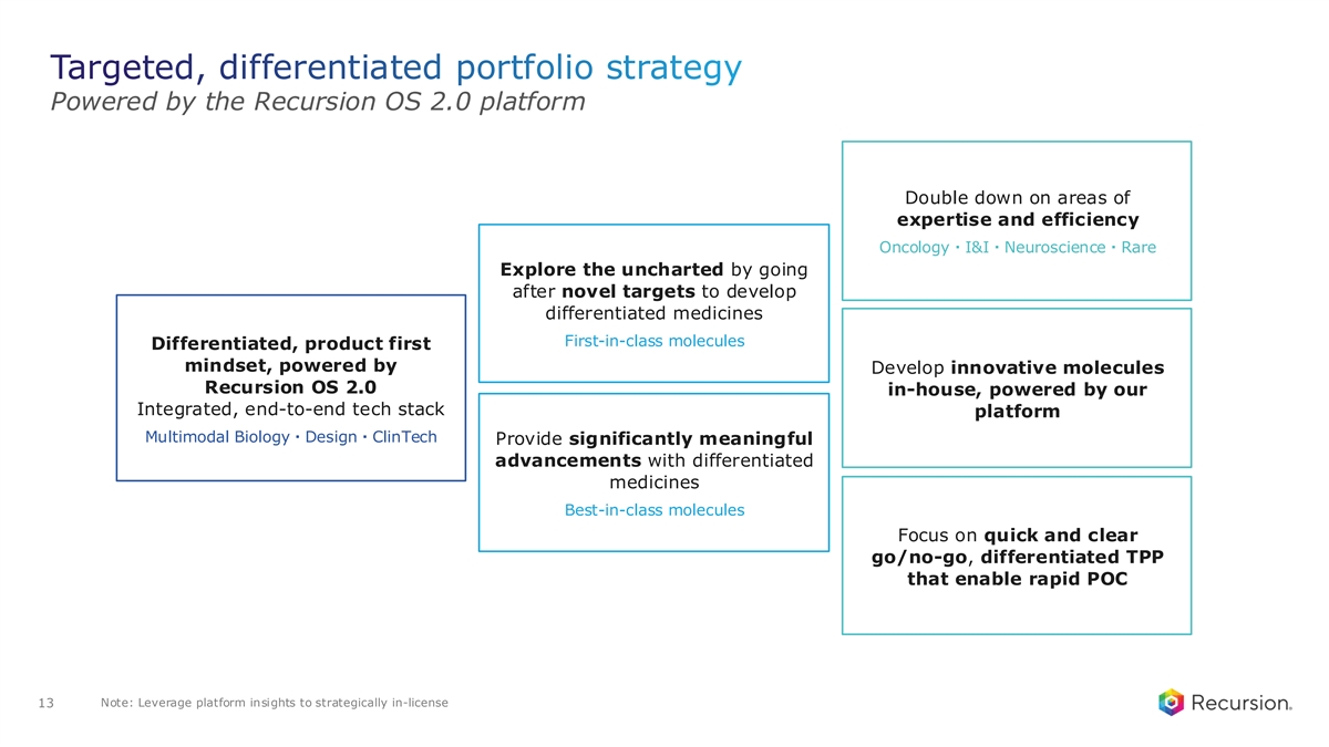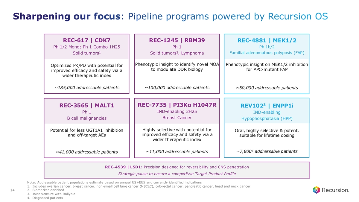 Targeted, differentiated portfolio strategy Powered by the Recursion OS 2.0 platform Double down on areas of expertise and efficiency Oncology・I&I・Neuroscience・Rare Explore the uncharted by going after novel targets to develop differentiated medicines First-in-class molecules Differentiated, product first mindset, powered by Develop innovative molecules Recursion OS 2.0 in-house, powered by our Integrated, end-to-end tech stack platform Multimodal Biology・Design・ClinTech Provide significantly meaningful advancements with differentiated medicines Best-in-class molecules Focus on quick and clear go/no-go, differentiated TPP that enable rapid POC Note: Leverage platform insights to strategically in-license 13