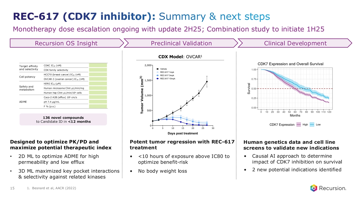 Sharpening our focus: Pipeline programs powered by Recursion OS REC-617 | CDK7 REC-1245 | RBM39 REC-4881 | MEK1/2 Ph 1/2 Mono; Ph 1 Combo 1H25 Ph 1 Ph 1b/2 1 2 Familial adenomatous polyposis (FAP) Solid tumors Solid tumors , Lymphoma Phenotypic insight to identify novel MOA Phenotypic insight on MEK1/2 inhibition Optimized PK/PD with potential for to modulate DDR biology for APC-mutant FAP improved efficacy and safety via a wider therapeutic index ~185,000 addressable patients ~100,000 addressable patients ~50,000 addressable patients 3 REC-7735 | PI3Kα H1047R REC-3565 | MALT1 REV102 | ENPP1i IND-enabling 2H25 Ph 1 IND-enabling Breast Cancer B cell malignancies Hypophosphatasia (HPP) Highly selective with potential for Potential for less UGT1A1 inhibition Oral, highly selective & potent, improved efficacy and safety via a and off-target AEs suitable for lifetime dosing wider therapeutic index 4 ~7,800 addressable patients ~41,000 addressable patients ~11,000 addressable patients REC-4539 | LSD1: Precision designed for reversibility and CNS penetration Strategic pause to ensure a competitive Target Product Profile Note: Addressable patient populations estimate based on annual US+EU5 and currently identified indications 1. Includes ovarian cancer, breast cancer, non-small cell lung cancer (NSCLC), colorectal cancer, pancreatic cancer, head and neck cancer 2. Biomarker-enriched 14 3. Joint Venture with Rallybio 4. Diagnosed patients