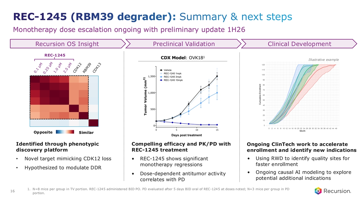 REC-1245 (RBM39 degrader): Summary & next steps Monotherapy dose escalation ongoing with preliminary update 1H26 Recursion OS Insight Preclinical Validation Clinical Development REC-1245 1 CDX Model: OVK18 Illustrative example Opposite Similar Identified through phenotypic Compelling efficacy and PK/PD with Ongoing ClinTech work to accelerate discovery platform REC-1245 treatment enrollment and identify new indications • Using RWD to identify quality sites for • Novel target mimicking CDK12 loss • REC-1245 shows significant monotherapy regressions faster enrollment • Hypothesized to modulate DDR • Ongoing causal AI modeling to explore • Dose-dependent antitumor activity potential additional indications correlates with PD 1. N=8 mice per group in TV portion. REC-1245 administered BID PO. PD evaluated after 5 days BID oral of REC-1245 at doses noted; N=3 mice per group in PD 16 portion.