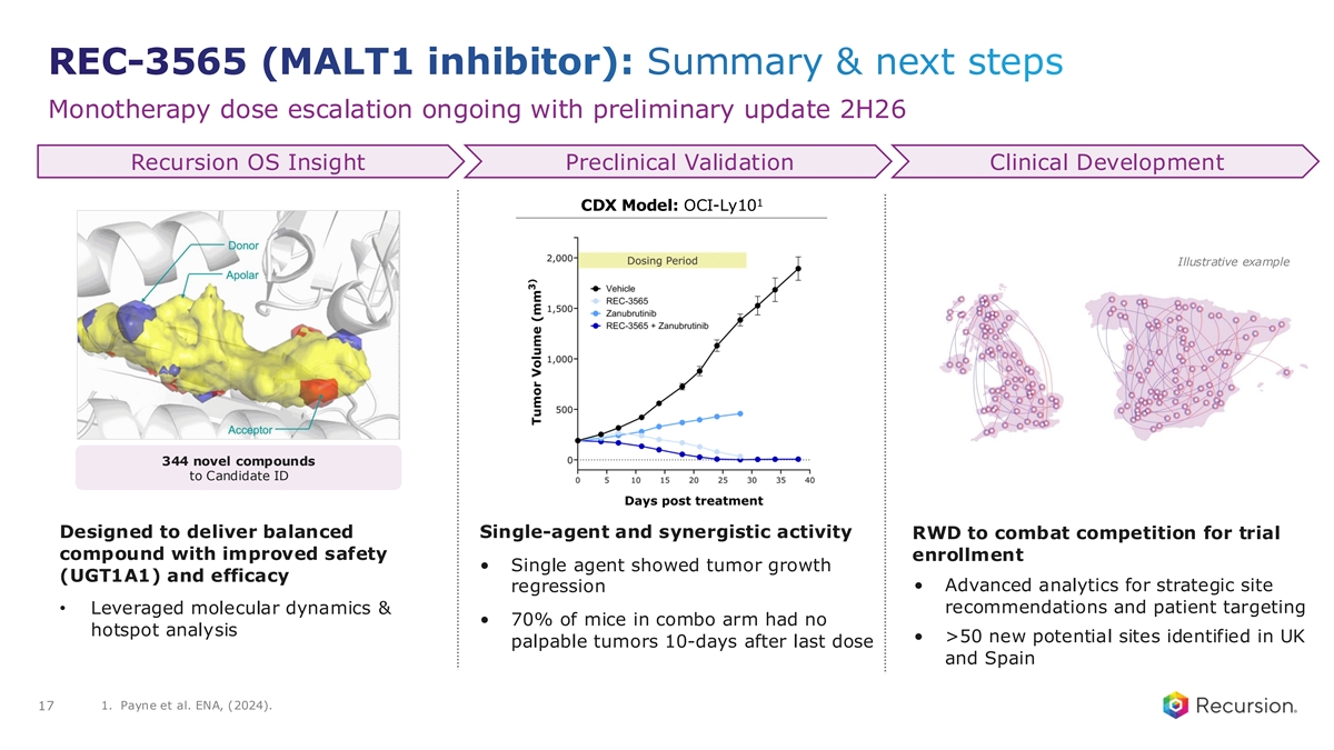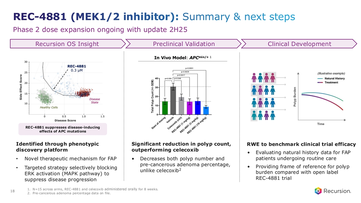 REC-3565 (MALT1 inhibitor): Summary & next steps Monotherapy dose escalation ongoing with preliminary update 2H26 Recursion OS Insight Preclinical Validation Clinical Development 1 CDX Model: OCI-Ly10 Illustrative example 344 novel compounds to Candidate ID Designed to deliver balanced Single-agent and synergistic activity RWD to combat competition for trial compound with improved safety enrollment • Single agent showed tumor growth (UGT1A1) and efficacy • Advanced analytics for strategic site regression • Leveraged molecular dynamics & recommendations and patient targeting • 70% of mice in combo arm had no hotspot analysis • >50 new potential sites identified in UK palpable tumors 10-days after last dose and Spain 1. Payne et al. ENA, (2024). 17