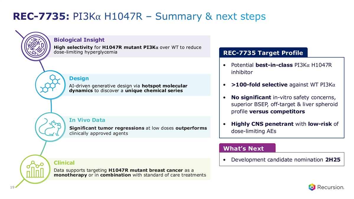 REC-7735: PI3K⍺ H1047R – Summary & next steps Biological Insight High selectivity for H1047R mutant PI3K⍺ over WT to reduce dose-limiting hyperglycemia REC-7735 Target Profile • Potential best-in-class PI3K⍺ H1047R inhibitor Design • >100-fold selective against WT PI3K⍺ AI-driven generative design via hotspot molecular dynamics to discover a unique chemical series • No significant in-vitro safety concerns, superior BSEP, off-target & liver spheroid profile versus competitors In Vivo Data • Highly CNS penetrant with low-risk of Significant tumor regressions at low doses outperforms dose-limiting AEs clinically approved agents What’s Next • Development candidate nomination 2H25 Clinical Data supports targeting H1047R mutant breast cancer as a monotherapy or in combination with standard of care treatments 19