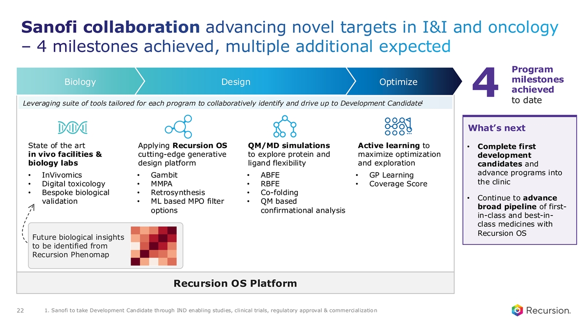 Sanofi collaboration advancing novel targets in I&I and oncology – 4 milestones achieved, multiple additional expected Program milestones Biology Design Optimize achieved 4 to date 1 Leveraging suite of tools tailored for each program to collaboratively identify and drive up to Development Candidate What’s next State of the art Applying Recursion OS QM/MD simulations Active learning to • Complete first in vivo facilities & cutting-edge generative to explore protein and maximize optimization development biology labs design platform ligand flexibility and exploration candidates and advance programs into • InVivomics• Gambit• ABFE• GP Learning the clinic • Digital toxicology• MMPA• RBFE• Coverage Score • Bespoke biological • Retrosynthesis• Co-folding • Continue to advance validation• ML based MPO filter • QM based broad pipeline of first- options confirmational analysis in-class and best-in- class medicines with Recursion OS Future biological insights to be identified from Recursion Phenomap Recursion OS Platform 1. Sanofi to take Development Candidate through IND enabling studies, clinical trials, regulatory approval & commercialization 22