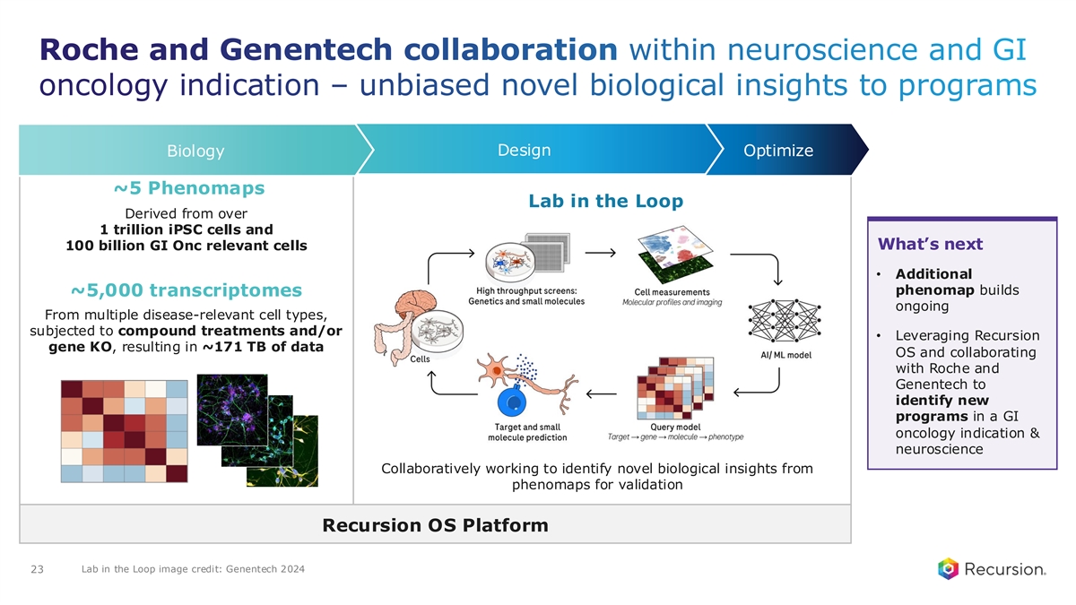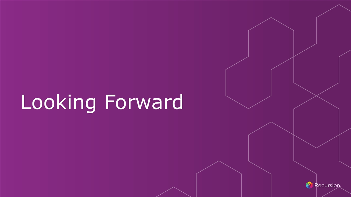 Roche and Genentech collaboration within neuroscience and GI oncology indication – unbiased novel biological insights to programs Design Biology Optimize ~5 Phenomaps Lab in the Loop Derived from over 1 trillion iPSC cells and What’s next 100 billion GI Onc relevant cells • Additional phenomap builds ~5,000 transcriptomes ongoing From multiple disease-relevant cell types, subjected to compound treatments and/or • Leveraging Recursion gene KO, resulting in ~171 TB of data OS and collaborating with Roche and Genentech to identify new programs in a GI oncology indication & neuroscience Collaboratively working to identify novel biological insights from phenomaps for validation Recursion OS Platform Lab in the Loop image credit: Genentech 2024 23