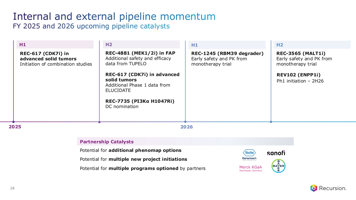 Solidifying Recursion’s leadership in TechBio Our sustainable and continued growth plan • Commitment to internal pipeline – Strong investment behind more focused pipeline • Execution on partnerships – Fully resourced to deliver on programs and achieve milestones • Transforming drug discovery and development – Expanding leadership in AI-based drug discovery and automation by advancing differentiated molecules • Increasing efficiency – Our scale and technologies continue to allow us to do more with less • Investment in Recursion OS – Integrated end-to- end tech stack driving better decision making 27