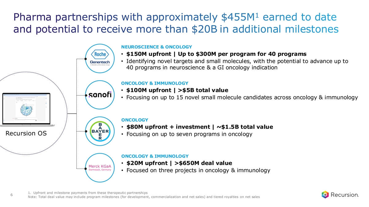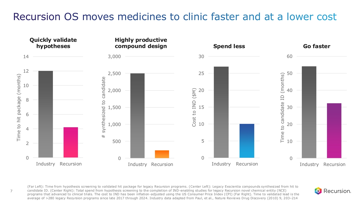 1 Pharma partnerships with approximately $455M earned to date and potential to receive more than $20B in additional milestones NEUROSCIENCE & ONCOLOGY • $150M upfront | Up to $300M per program for 40 programs • Identifying novel targets and small molecules, with the potential to advance up to 40 programs in neuroscience & a GI oncology indication ONCOLOGY & IMMUNOLOGY • $100M upfront | >$5B total value • Focusing on up to 15 novel small molecule candidates across oncology & immunology ONCOLOGY • $80M upfront + investment | ~$1.5B total value Recursion OS • Focusing on up to seven programs in oncology ONCOLOGY & IMMUNOLOGY • $20M upfront | >$650M deal value • Focused on three projects in oncology & immunology 1. Upfront and milestone payments from these therapeutic partnerships 6 Note: Total deal value may include program milestones (for development, commercialization and net sales) and tiered royalties on net sales