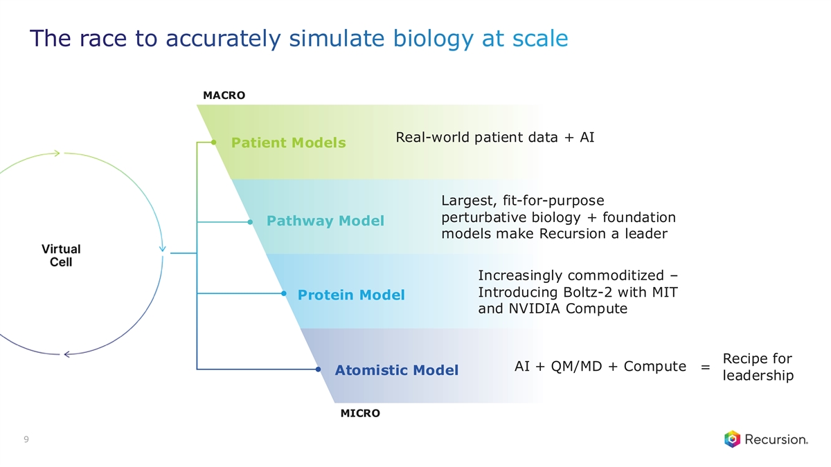 The race to accurately simulate biology at scale MACRO Real-world patient data + AI Patient Models Largest, fit-for-purpose perturbative biology + foundation Pathway Model models make Recursion a leader Increasingly commoditized – Introducing Boltz-2 with MIT Protein Model and NVIDIA Compute Recipe for AI + QM/MD + Compute = Atomistic Model leadership MICRO 9
