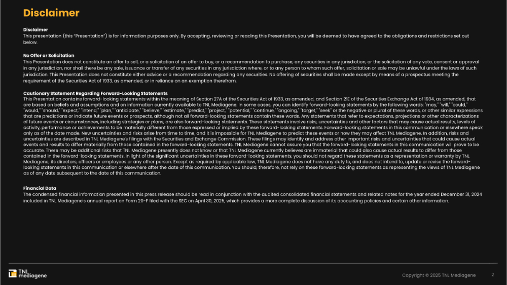 Disclaimer 2 Copyright © 2025 TNL Mediagene Disclaimer This presentation (this “Presentation”) is for information purposes only. By accepting, reviewing or reading this Presentation, you will be deemed to have agreed to the obligations and restrictions set out below. No Offer or Solicitation This Presentation does not constitute an offer to sell, or a solicitation of an offer to buy, or a recommendation to purchase, any securities in any jurisdiction, or the solicitation of any vote, consent or approval in any jurisdiction, nor shall there be any sale, issuance or transfer of any securities in any jurisdiction where, or to any person to whom such offer, solicitation or sale may be unlawful under the laws of such jurisdiction. This Presentation does not constitute either advice or a recommendation regarding any securities. No offering of securities shall be made except by means of a prospectus meeting the requirement of the Securities Act of 1933, as amended, or in reliance on an exemption therefrom. Cautionary Statement Regarding Forward - Looking Statements This Presentation contains forward - looking statements within the meaning of Section 27A of the Securities Act of 1933, as amended, and Section 21E of the Securities Exchange Act of 1934, as amended, that are based on beliefs and assumptions and on information currently available to TNL Mediagene. In some cases, you can identify forward - looking statements by the following words: "may," "will," "could," "would," "should," "expect," "intend," "plan," "anticipate," "believe," "estimate," "predict," "project," "potential," "continue," "ongoing," "target," "seek" or the negative or plural of these words, or other similar expressions that are predictions or indicate future events or prospects, although not all forward - looking statements contain these words. Any statements that refer to expectations, projections or other characterizations of future events or circumstances, including strategies or plans, are also forward - looking statements. These statements involve risks, uncertainties and other factors that may cause actual results, levels of activity, performance or achievements to be materially different from those expressed or implied by these forward - looking statements. Forward - looking statements in this communication or elsewhere speak only as of the date made. New uncertainties and risks arise from time to time, and it is impossible for TNL Mediagene to predict these events or how they may affect TNL Mediagene. In addition, risks and uncertainties are described in TNL Mediagene's filings with the Securities and Exchange Commission. These filings may identify and address other important risks and uncertainties that could cause actual events and results to differ materially from those contained in the forward - looking statements. TNL Mediagene cannot assure you that the forward - looking statements in this communication will prove to be accurate. There may be additional risks that TNL Mediagene presently does not know or that TNL Mediagene currently believes are immaterial that could also cause actual results to differ from those contained in the forward - looking statements. In light of the significant uncertainties in these forward - looking statements, you should not regard these statements as a representation or warranty by TNL Mediagene, its directors, officers or employees or any other person. Except as required by applicable law, TNL Mediagene does not have any duty to, and does not intend to, update or revise the forward - looking statements in this communication or elsewhere after the date of this communication. You should, therefore, not rely on these forward - looking statements as representing the views of TNL Mediagene as of any date subsequent to the date of this communication. Financial Data The condensed financial information presented in this press release should be read in conjunction with the audited consolidated financial statements and related notes for the year ended December 31, 2024 included in TNL Mediagene's annual report on Form 20 - F filed with the SEC on April 30, 2025, which provides a more complete discussion of its accounting policies and certain other information.