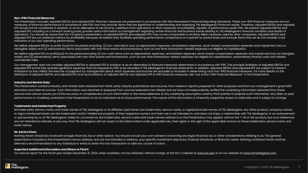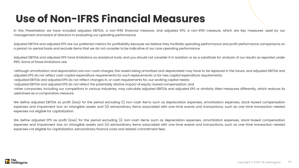 Use of Non - IFRS Financial Measures In this Presentation we have included adjusted EBITDA, a non - IFRS financial measure, and adjusted EPS, a non - IFRS measure, which are key measures used by our management and board of directors in evaluating our operating performance . Adjusted EBITDA and adjusted EPS are our preferred metrics for profitability because we believe they facilitate operating performance and profit performance comparisons on a period - to - period basis and exclude items that we do not consider to be indicative of our core operating performance . Adjusted EBITDA and adjusted EPS have limitations as analytical tools, and you should not consider it in isolation or as a substitute for analysis of our results as reported under IFRS . Some of these limitations are : • although amortization and depreciation are non - cash charges, the assets being amortized and depreciated may have to be replaced in the future, and adjusted EBITDA and adjusted EPS do not reflect cash capital expenditure requirements for such replacements or for new capital expenditure requirements; • adjusted EBITDA and adjusted EPS do not reflect changes in, or cash requirements for, our working capital needs; • adjusted EBITDA and adjusted EPS do not reflect the potentially dilutive impact of equity - based compensation; and • other companies, including our competitors in various industries, may calculate adjusted EBITDA and adjusted EPS or similarly titled measures differently, which reduces its usefulness as a comparative measure. We define adjusted EBITDA as profit (loss) for the period excluding (i) non - cash items such as depreciation expenses, amortization expenses, stock - based compensation expenses and impairment loss on intangible assets and (ii) extraordinary items associated with one - time events and transactions, such as one - time transaction - related expenses not eligible for capitalization . We define adjusted EPS as profit (loss) for the period excluding (i) non - cash items such as depreciation expenses, amortization expenses, stock - based compensation expenses and impairment loss on intangible assets and (ii) extraordinary items associated with one - time events and transactions, such as one - time transaction - related expenses not eligible for capitalization, extraordinary finance costs and related commitment fees . 52 Copyright © 2025 TNL Mediagene