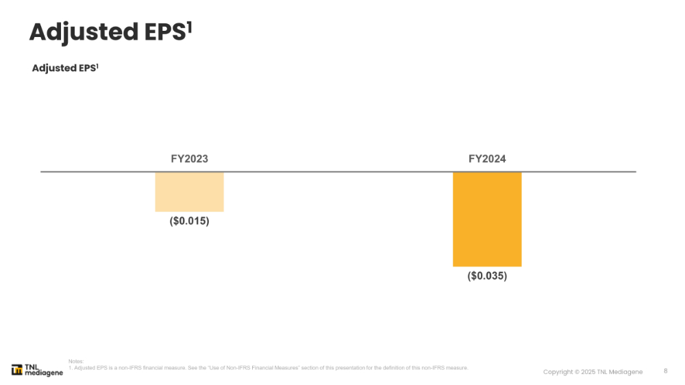 Copyright © 2025 TNL Mediagene Adjusted EPS 1 Adjusted EPS 1 8 ($0.015) ($0.035) FY2023 FY2024 Notes: 1. Adjusted EPS is a non - IFRS financial measure. See the “Use of Non - IFRS Financial Measures” section of this presentation for the definition of this non - IFRS measure.