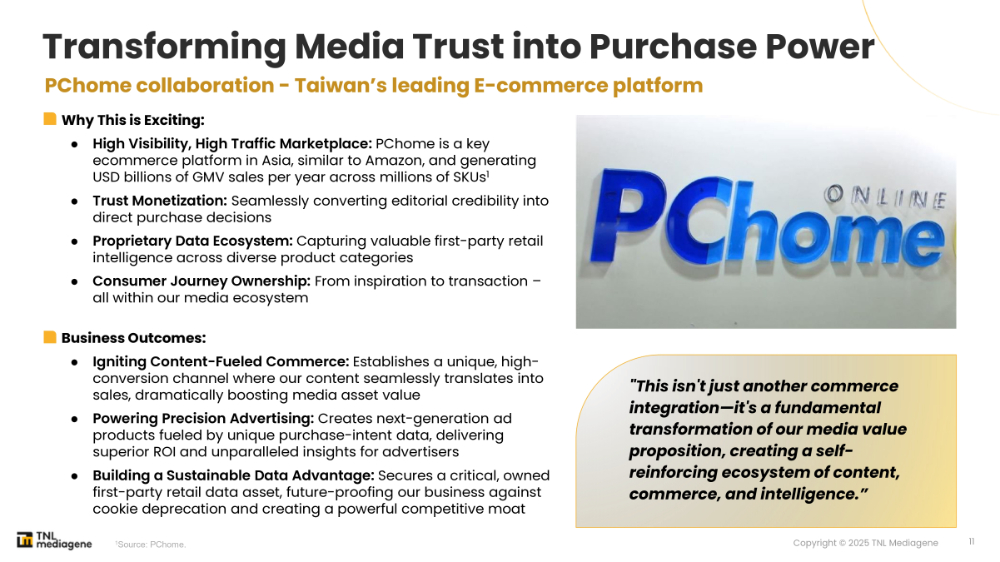 Copyright © 2025 TNL Mediagene PChome collaboration - Taiwan’s leading E - commerce platform Why This is Exciting: ● High Visibility, High Traffic Marketplace: PChome is a key ecommerce platform in Asia, similar to Amazon, and generating USD billions of GMV sales per year across millions of SKUs 1 ● Trust Monetization: Seamlessly converting editorial credibility into direct purchase decisions ● Proprietary Data Ecosystem: Capturing valuable first - party retail intelligence across diverse product categories ● Consumer Journey Ownership: From inspiration to transaction – all within our media ecosystem Business Outcomes: ● Igniting Content - Fueled Commerce: Establishes a unique, high - conversion channel where our content seamlessly translates into sales, dramatically boosting media asset value ● Powering Precision Advertising: Creates next - generation ad products fueled by unique purchase - intent data, delivering superior ROI and unparalleled insights for advertisers ● Building a Sustainable Data Advantage: Secures a critical, owned first - party retail data asset, future - proofing our business against cookie deprecation and creating a powerful competitive moat "This isn't just another commerce integration — it's a fundamental transformation of our media value proposition, creating a self - reinforcing ecosystem of content, commerce, and intelligence.” Transforming Media Trust into Purchase Power 11 1 Source: PChome.