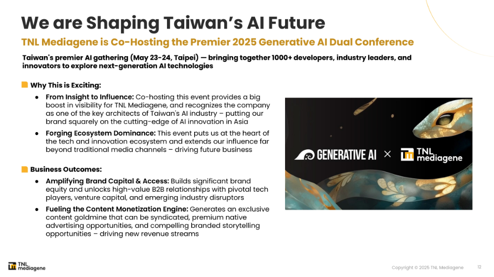 TNL Mediagene is Co - Hosting the Premier 2025 Generative AI Dual Conference Taiwan's premier AI gathering (May 23 - 24, Taipei) — bringing together 1000+ developers, industry leaders, and innovators to explore next - generation AI technologies Why This is Exciting: ● From Insight to Influence: Co - hosting this event provides a big boost in visibility for TNL Mediagene, and recognizes the company as one of the key architects of Taiwan's AI industry – putting our brand squarely on the cutting - edge of AI innovation in Asia ● Forging Ecosystem Dominance : This event puts us at the heart of the tech and innovation ecosystem and extends our influence far beyond traditional media channels – driving future business Business Outcomes: ● Amplifying Brand Capital & Access: Builds significant brand equity and unlocks high - value B2B relationships with pivotal tech players, venture capital, and emerging industry disruptors ● Fueling the Content Monetization Engine: Generates an exclusive content goldmine that can be syndicated, premium native advertising opportunities, and compelling branded storytelling opportunities – driving new revenue streams We are Shaping Taiwan’s AI Future 12 Copyright © 2025 TNL Mediagene