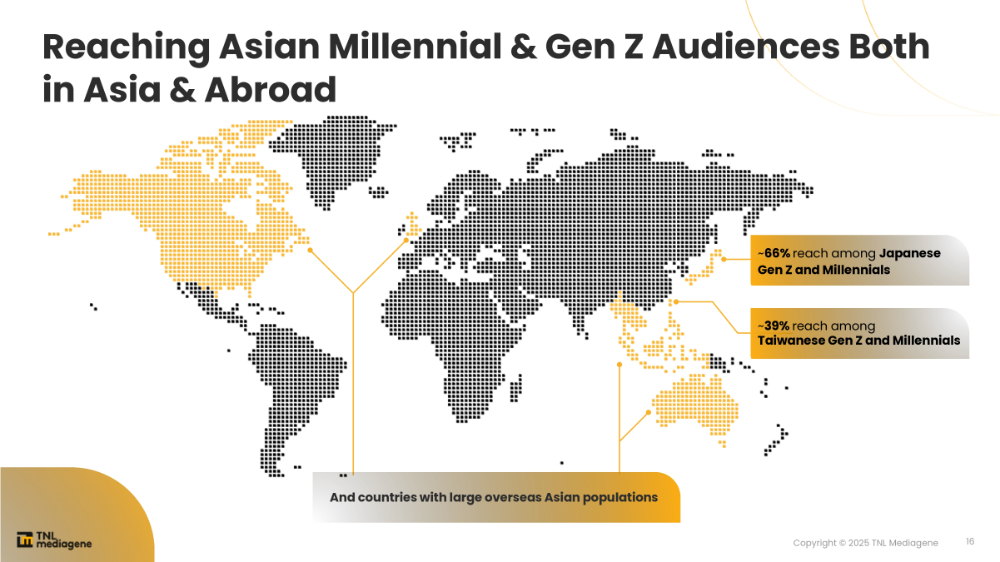 ~ 66% reach among Japanese Gen Z and Millennials ~ 39% reach among Taiwanese Gen Z and Millennials Reaching Asian Millennial & Gen Z Audiences Both in Asia & Abroad And countries with large overseas Asian populations 16 Copyright © 2025 TNL Mediagene