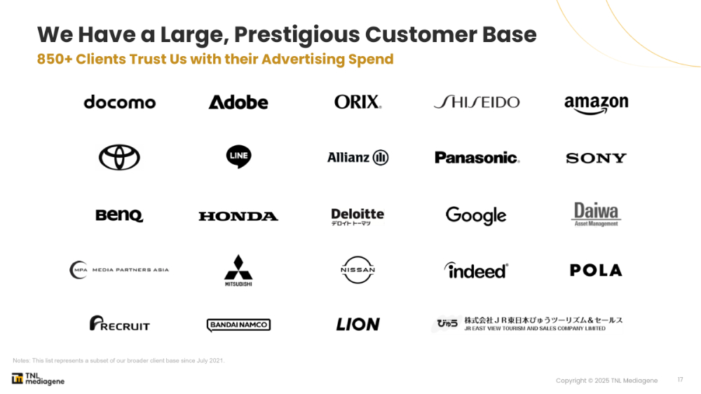 Notes: This list represents a subset of our broader client base since July 2021. 17 Copyright © 2025 TNL Mediagene We Have a Large, Prestigious Customer Base 850+ Clients Trust Us with their Advertising Spend