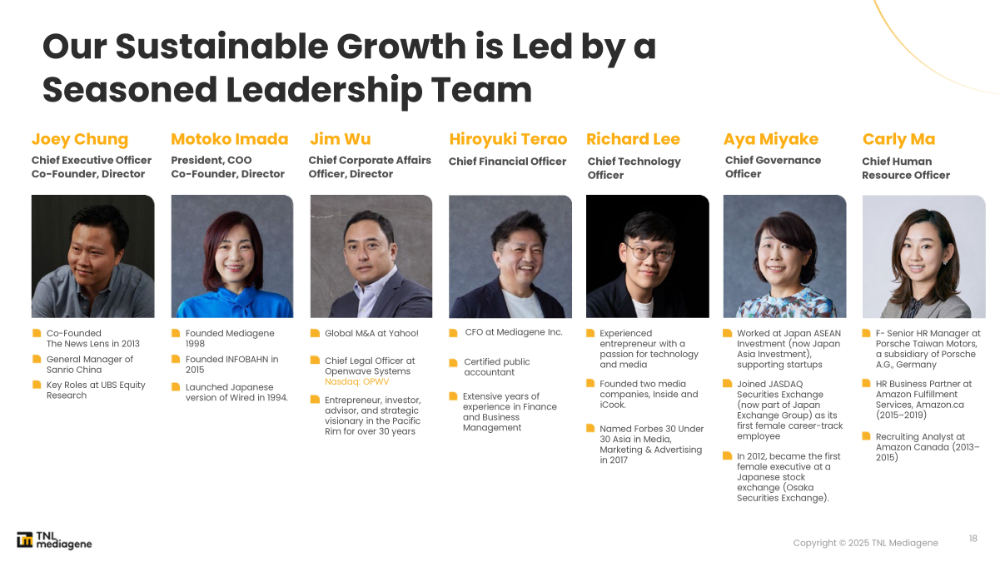 Our Sustainable Growth is Led by a Seasoned Leadership Team Carly Ma Aya Miyake Richard Lee Hiroyuki Terao Jim Wu Motoko Imada Joey Chung Chief Human Chief Governance Chief Technology Chief Financial Officer Chief Corporate Affairs President, COO Chief Executive Officer Resource Officer Officer Officer Officer, Director Co - Founder, Director Co - Founder, Director General Manager of Sanrio China Key Roles at UBS Equity Research Founded INFOBAHN in 2015 Launched Japanese version of Wired in 1994. a subsidiary of Porsche A.G., Germany HR Business Partner at Amazon Fulfillment Services, Amazon.ca (2015 – 2019) Recruiting Analyst at Amazon Canada (2013 – 2015) Asia Investment), supporting startups Joined JASDAQ Securities Exchange (now part of Japan Exchange Group) as its first female career - track employee In 2012, became the first female executive at a Japanese stock exchange (Osaka Securities Exchange). F - Senior HR Manager at Worked at Japan ASEAN Experienced CFO at Mediagene Inc. Global M&A at Yahoo! Founded Mediagene Co - Founded Porsche Taiwan Motors, Investment (now Japan entrepreneur with a 1998 The News Lens in 2013 Extensive years of experience in Finance and Business Management Chief Legal Officer at Openwave Systems Nasdaq: OPWV Entrepreneur, investor, advisor, and strategic visionary in the Pacific Rim for over 30 years Certified public accountant passion for technology and media Founded two media companies, Inside and iCook. Named Forbes 30 Under 30 Asia in Media, Marketing & Advertising in 2017 18 Copyright © 2025 TNL Mediagene