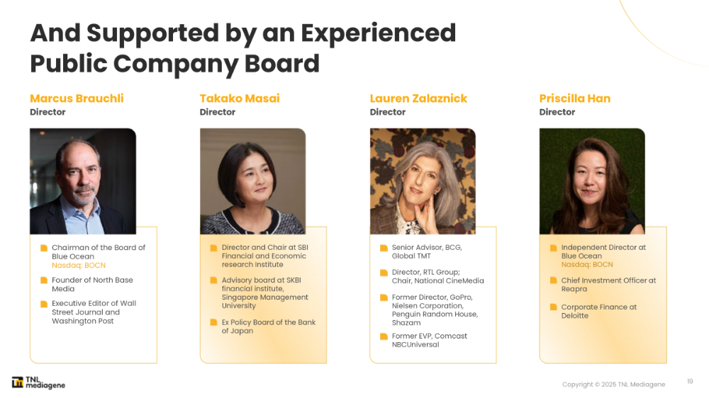 Marcus Brauchli Director Chairman of the Board of Blue Ocean Nasdaq: BOCN Founder of North Base Media Executive Editor of Wall Street Journal and Washington Post Takako Masai Director Director and Chair at SBI Financial and Economic research Institute Advisory board at SKBI financial institute, Singapore Management University Ex Policy Board of the Bank of Japan Lauren Zalaznick Director Senior Advisor, BCG, Global TMT Director, RTL Group; Chair, National CineMedia Former Director, GoPro, Nielsen Corporation, Penguin Random House, Shazam Former EVP, Comcast NBCUniversal Priscilla Han Director Independent Director at Blue Ocean Nasdaq: BOCN Chief Investment Officer at Reapra Corporate Finance at Deloitte And Supported by an Experienced Public Company Board 19 Copyright © 2025 TNL Mediagene