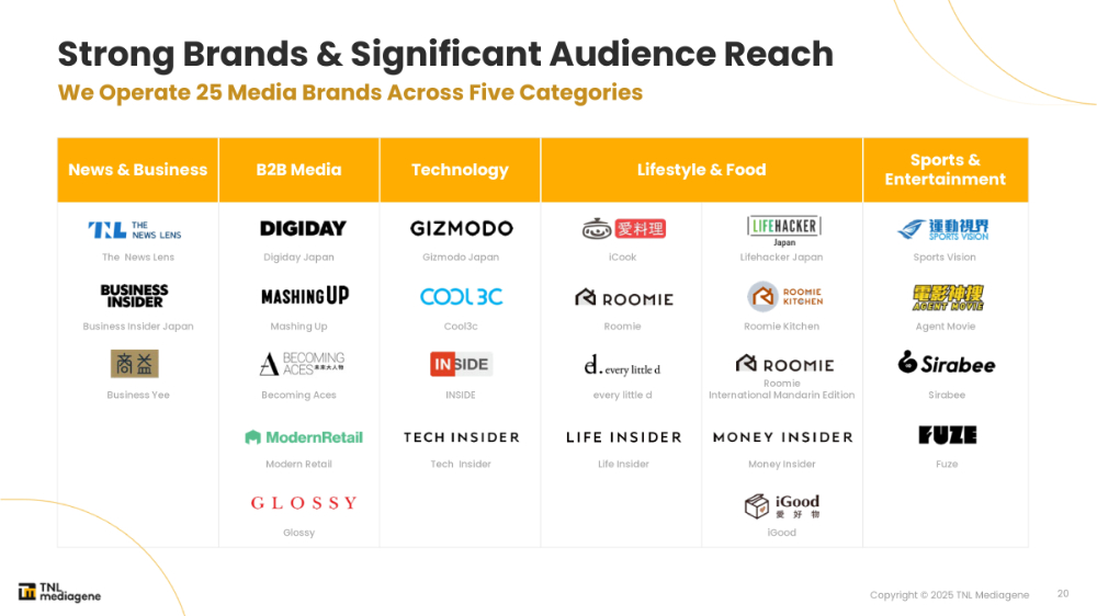 Sports & Entertainment Lifestyle & Food Technology B2B Media News & Business Sports Vision Agent Movie Sirabee Fuze Lifehacker Japan Roomie Kitchen Roomie International Mandarin Edition Money Insider iGood iCook Roomie every little d Life Insider Gizmodo Japan Cool3c INSIDE Tech Insider Digiday Japan Mashing Up Becoming Aces Modern Retail Glossy The News Lens Business Insider Japan Business Yee Strong Brands & Significant Audience Reach We Operate 25 Media Brands Across Five Categories 20 Copyright © 2025 TNL Mediagene