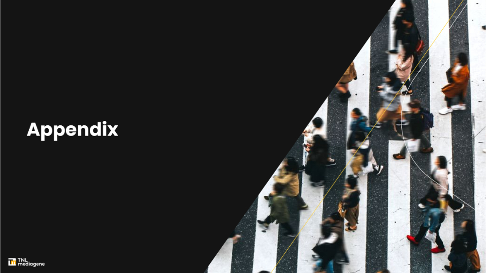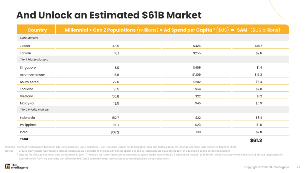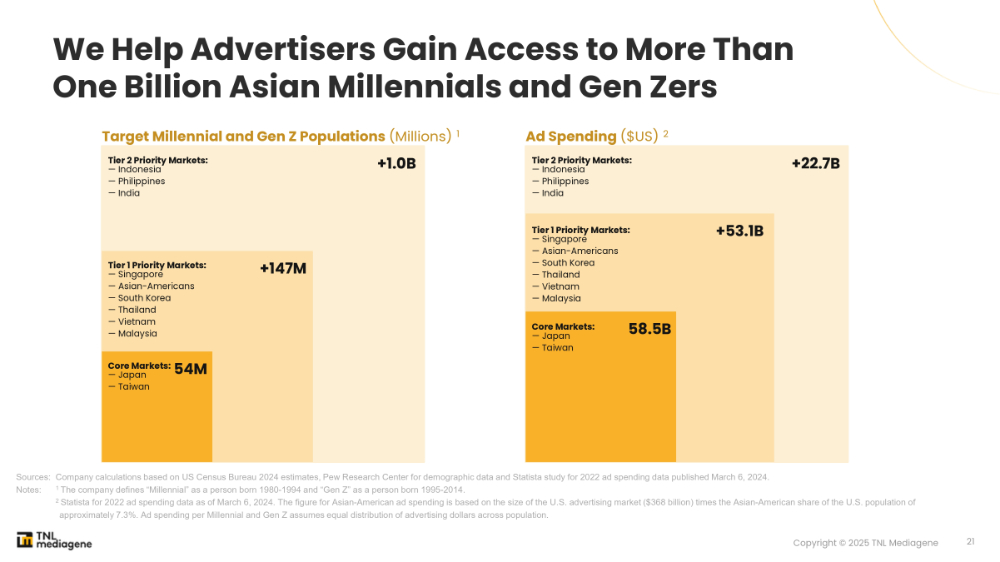Core Markets $18.7 $426 43.9 Japan $2.6 $255 10.1 Taiwan Tier 1 Priority Markets $1.4 $459 3.0 Singapore $15.3 $1,109 13.8 Asian - American $6.4 $292 22.0 South Korea $2.0 $64 31.5 Thailand $1.2 $22 56.8 Vietnam $0.9 $45 19.5 Malaysia Tier 2 Priority Markets $3.4 $22 152.7 Indonesia $1.6 $23 68.1 Philippines $7.8 $10 807.2 India $61.3 Total Country Millennial + Gen Z Populations (millions) ð Ad Spend per Capita 2 ($US) = SAM ¹ ($US billions) Sources: Company calculations based on US Census Bureau 2024 estimates, Pew Research Center for demographic data and Statista study for 2022 ad spending data published March 6, 2024. Notes: ¹ SAM is Serviceable Addressable Market, calculated as a product of average advertising spend per capita (calculated as equal distribution of advertising spend across population). And Unlock an Estimated $61B Market 2 Statista for 2022 ad spending data as of March 6, 2024. The figure for Asian - American ad spending is based on the size of the $US advertising market ($368 billion) times the Asian - American share of the U.S. population of approximately 7.3%. Ad spending per Millennial and Gen Z assumes equal distribution of advertising dollars across population. 22 Copyright © 2025 TNL Mediagene