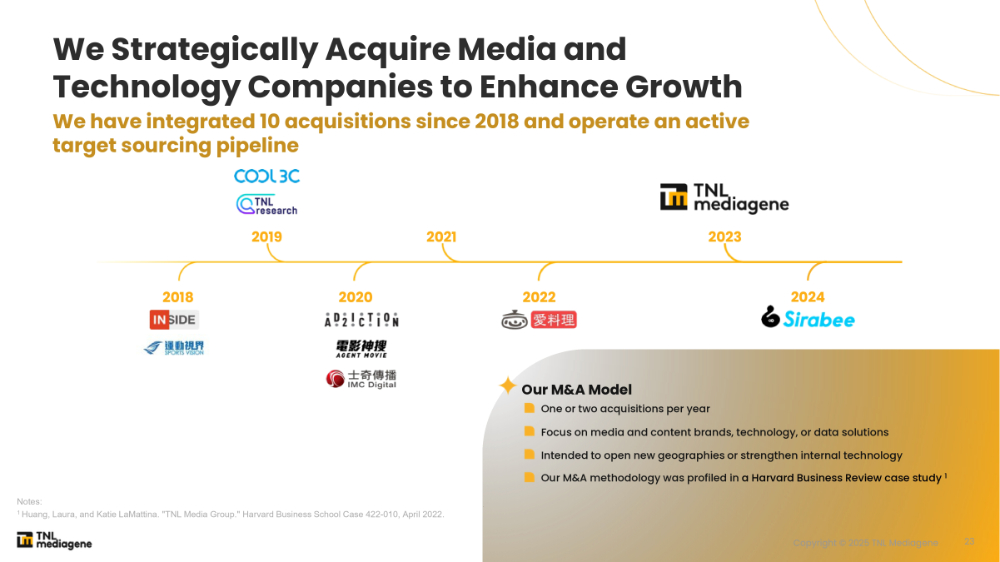 Our M&A Model One or two acquisitions per year Focus on media and content brands, technology, or data solutions Intended to open new geographies or strengthen internal technology Our M&A methodology was profiled in a Harvard Business Review case study 1 Notes: We Strategically Acquire Media and Technology Companies to Enhance Growth We have integrated 10 acquisitions since 2018 and operate an active target sourcing pipeline 2018 2020 2022 2019 2023 2021 2024 1 Huang, Laura, and Katie LaMattina. "TNL Media Group." Harvard Business School Case 422 - 010, April 2022. 23 Copyright © 2025 TNL Mediagene