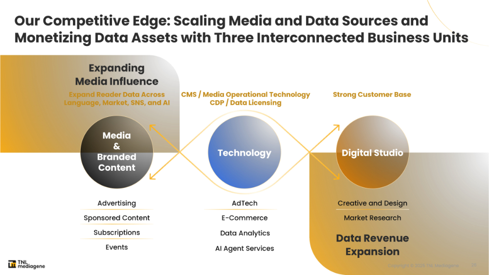 Integrated Business Ecosystem With 3 Business Units Data Technology Media E - commerce Ad Tech Al Customer Data Service Research Data Analytics User Data Content IMC/Events Advertising $ We strategically leverage cross - selling opportunities to enhance service adoption among our existing customer base. 25 Copyright © 2025 TNL Mediagene