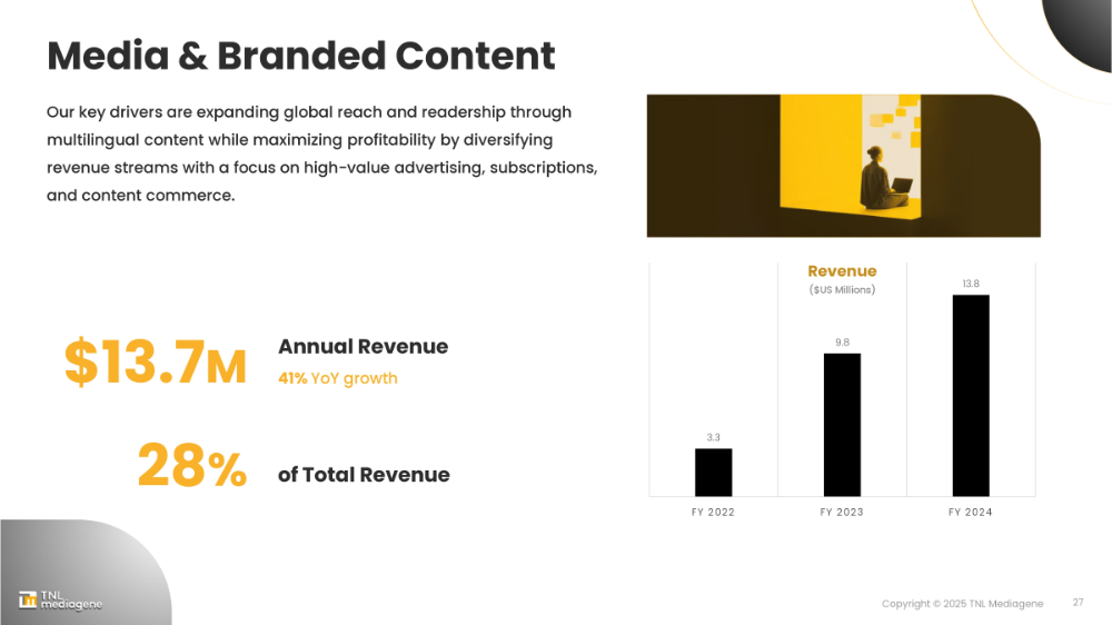 Media & Branded Content Our key drivers are expanding global reach and readership through multilingual content while maximizing profitability by diversifying revenue streams with a focus on high - value advertising, subscriptions, and content commerce. $13.7 M 28 % Annual Revenue 41% YoY growth Revenue ($US Millions) of Total Revenue 3.3 27 Copyright © 2025 TNL Mediagene 9.8 13.8 FY 2022 FY 2023 FY 2024