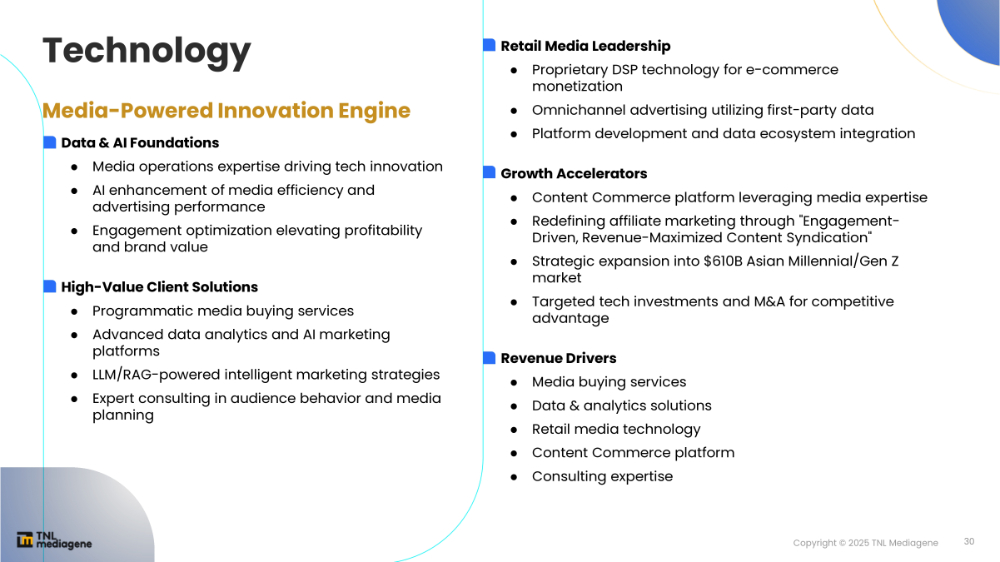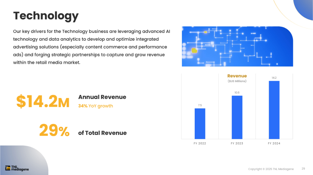 Technology Our key drivers for the Technology business are leveraging advanced AI technology and data analytics to develop and optimize integrated advertising solutions (especially content commerce and performance ads) and forging strategic partnerships to capture and grow revenue within the retail media market. $14.2 M 29 % of Total Revenue Annual Revenue 34% YoY growth Revenue ($US Millions) 7.5 29 Copyright © 2025 TNL Mediagene 10.6 14.2 FY 2022 FY 2023 FY 2024