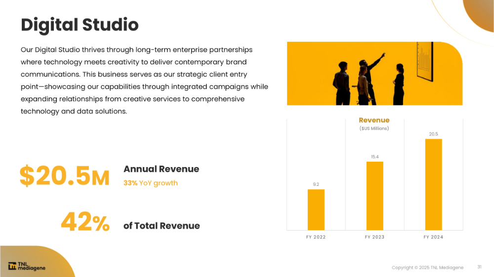 Digital Studio Our Digital Studio thrives through long - term enterprise partnerships where technology meets creativity to deliver contemporary brand communications. This business serves as our strategic client entry point — showcasing our capabilities through integrated campaigns while expanding relationships from creative services to comprehensive technology and data solutions. $20.5 M 42 % Revenue ($US Millions) of Total Revenue Annual Revenue 33% YoY growth 9.2 31 Copyright © 2025 TNL Mediagene 15.4 20.5 FY 2022 FY 2023 FY 2024