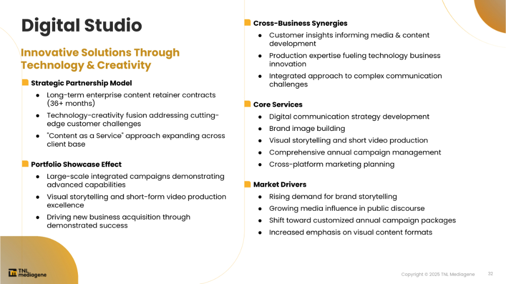 Cross - Business Synergies ● Customer insights informing media & content development ● Production expertise fueling technology business innovation ● Integrated approach to complex communication challenges Core Services ● Digital communication strategy development ● Brand image building ● Visual storytelling and short video production ● Comprehensive annual campaign management ● Cross - platform marketing planning Market Drivers ● Rising demand for brand storytelling ● Growing media influence in public discourse ● Shift toward customized annual campaign packages ● Increased emphasis on visual content formats Digital Studio Innovative Solutions Through Technology & Creativity Strategic Partnership Model ● Long - term enterprise content retainer contracts (36+ months) ● Technology - creativity fusion addressing cutting - edge customer challenges ● "Content as a Service" approach expanding across client base Portfolio Showcase Effect ● Large - scale integrated campaigns demonstrating advanced capabilities ● Visual storytelling and short - form video production excellence ● Driving new business acquisition through demonstrated success 32 Copyright © 2025 TNL Mediagene