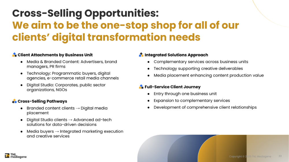 Cross - Selling Opportunities: We aim to be the one - stop shop for all of our clients’ digital transformation needs Client Attachments by Business Unit ● Media & Branded Content: Advertisers, brand managers, PR firms ● Technology: Programmatic buyers, digital agencies, e - commerce retail media channels ● Digital Studio: Corporates, public sector organizations, NGOs Cross - Selling Pathways ● Branded content clients → Digital media placement ● Digital Studio clients → Advanced ad - tech solutions for data - driven decisions ● Media buyers → Integrated marketing execution and creative services Integrated Solutions Approach ● Complementary services across business units ● Technology supporting creative deliverables ● Media placement enhancing content production value Full - Service Client Journey ● Entry through one business unit ● Expansion to complementary services ● Development of comprehensive client relationships 33 Copyright © 2025 TNL Mediagene