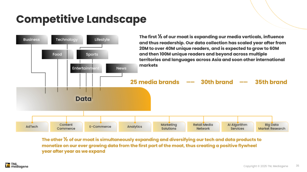Sports Business Technology Lifestyle Food Entertainment News Competitive Landscape The first ½ of our moat is expanding our media verticals, influence and thus readership. Our data collection has scaled year after from 20M to over 40M unique readers, and is expected to grow to 60M and then 100M unique readers and beyond across multiple territories and languages across Asia and soon other international markets The other ½ of our moat is simultaneously expanding and diversifying our tech and data products to monetize on our ever growing data from the first part of the moat, thus creating a positive flywheel year after year as we expand Big Data Market Research AI Algorithm Services Retail Media Network Marketing Solutions Content Commerce E - Commerce Analytics AdTech 30th brand 35th brand …… …… Data 25 media brands 35 Copyright © 2025 TNL Mediagene