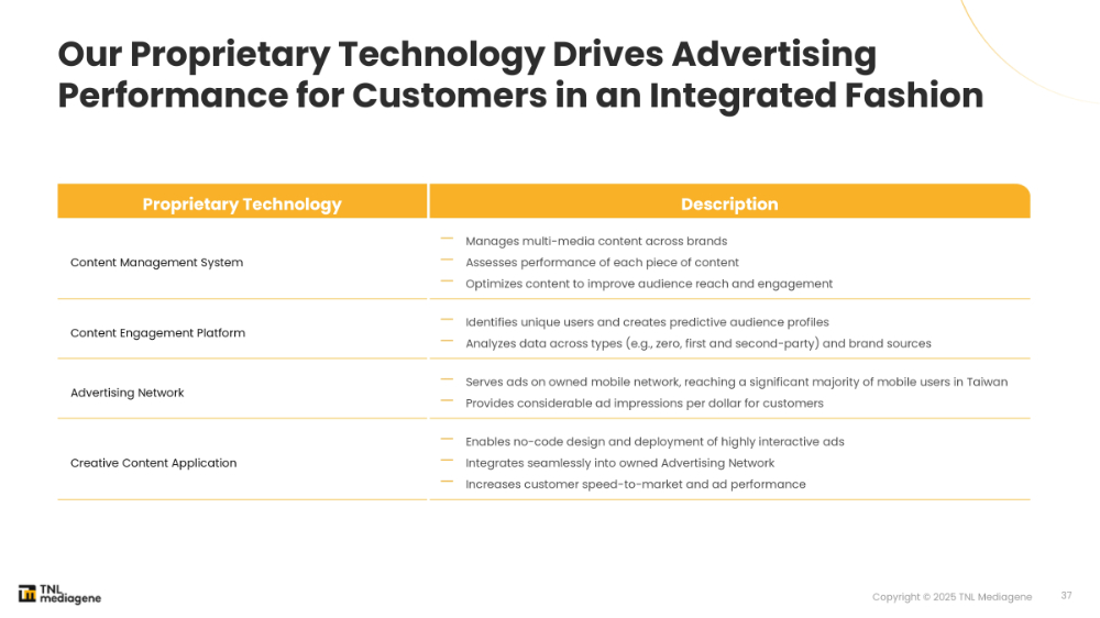 Proprietary Technology Enables no - code design and deployment of highly interactive ads Integrates seamlessly into owned Advertising Network Increases customer speed - to - market and ad performance Identifies unique users and creates predictive audience profiles Analyzes data across types (e.g., zero, first and second - party) and brand sources Serves ads on owned mobile network, reaching a significant majority of mobile users in Taiwan Provides considerable ad impressions per dollar for customers Description Manages multi - media content across brands Assesses performance of each piece of content Optimizes content to improve audience reach and engagement Content Management System 37 Copyright © 2025 TNL Mediagene Content Engagement Platform Advertising Network Creative Content Application Our Proprietary Technology Drives Advertising Performance for Customers in an Integrated Fashion
