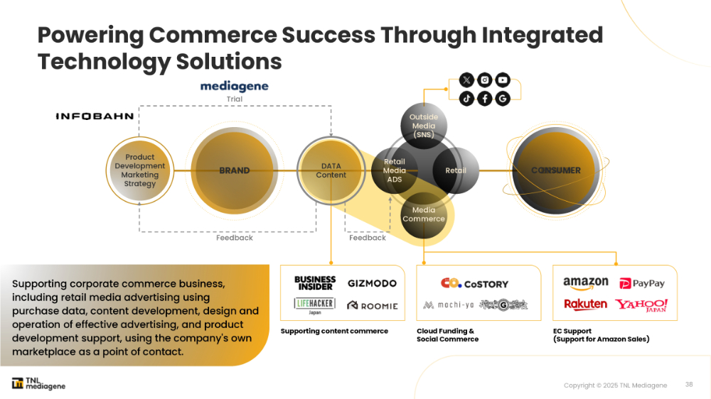 DATA Content Supporting corporate commerce business, including retail media advertising using purchase data, content development, design and operation of effective advertising, and product development support, using the company's own marketplace as a point of contact. Supporting content commerce Cloud Funding & Social Commerce EC Support (Support for Amazon Sales) Powering Commerce Success Through Integrated Technology Solutions Product Development Marketing Strategy BRAND Retail Media ADS Retail Outside Media (SNS) C O B N R S A U N M D E R Trial Feedback Feedback Media Commerce 38 Copyright © 2025 TNL Mediagene