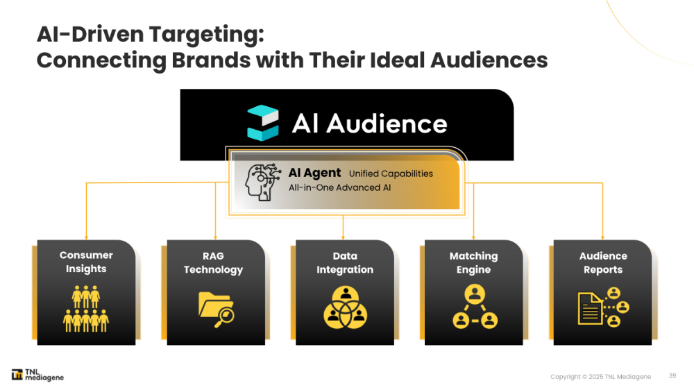 RAG Technology Consumer Insights Matching Engine Audience Reports Data Integration AI Agent All - in - One Advanced AI Unified Capabilities AI - Driven Targeting: Connecting Brands with Their Ideal Audiences 39 Copyright © 2025 TNL Mediagene