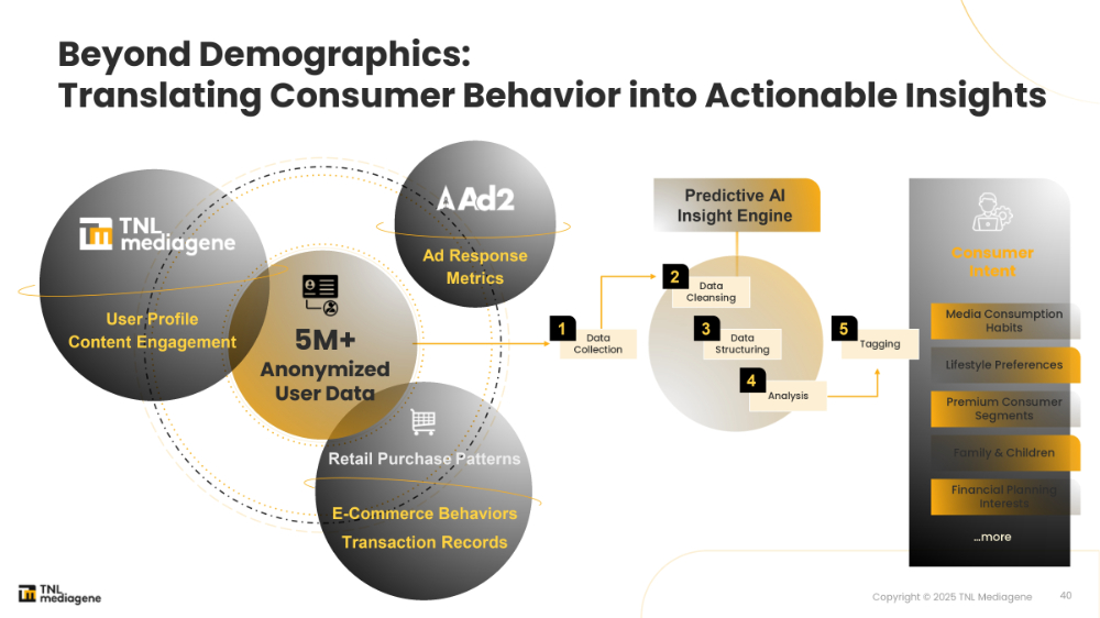 Media Consumption Habits Lifestyle Preferences Premium Consumer Segments Family & Children Financial Planning Interests Consumer Intent …more E - Commerce Behaviors Transaction Records Retail Purchase Patterns 5M+ Anonymized User Data Beyond Demographics: Translating Consumer Behavior into Actionable Insights User Profile Content Engagement Ad Response Metrics Predictive AI Insight Engine Data Collection 1 Data Cleansing 2 Data Structuring 3 Analysis 4 Tagging 5 40 Copyright © 2025 TNL Mediagene