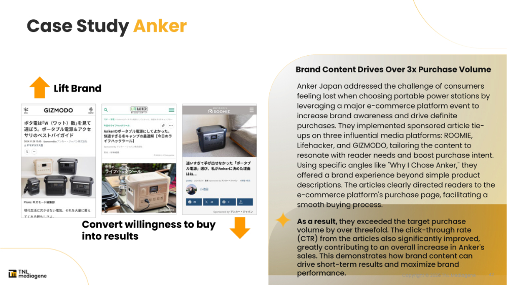 Case Study Anker performance. 42 Copyright © 2 0 2 5 4 TNL Mediagene Brand Content Drives Over 3x Purchase Volume Anker Japan addressed the challenge of consumers feeling lost when choosing portable power stations by leveraging a major e - commerce platform event to increase brand awareness and drive definite purchases. They implemented sponsored article tie - ups on three influential media platforms: ROOMIE, Lifehacker, and GIZMODO, tailoring the content to resonate with reader needs and boost purchase intent. Using specific angles like "Why I Chose Anker," they offered a brand experience beyond simple product descriptions. The articles clearly directed readers to the e - commerce platform's purchase page, facilitating a smooth buying process. As a result, they exceeded the target purchase volume by over threefold. The click - through rate (CTR) from the articles also significantly improved, greatly contributing to an overall increase in Anker's sales. This demonstrates how brand content can drive short - term results and maximize brand Lift Brand Convert willingness to buy into results