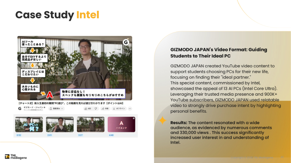 Case Study Intel GIZMODO JAPAN's Video Format: Guiding Students to Their Ideal PC GIZMODO JAPAN created YouTube video content to support students choosing PCs for their new life, focusing on finding their "ideal partner." This special content, commissioned by Intel, showcased the appeal of 13 AI PCs (Intel Core Ultra). Leveraging their trusted media presence and 900K+ YouTube subscribers, GIZMODO JAPAN used relatable video to strongly drive purchase intent by highlighting personal benefits. Results: The content resonated with a wide audience, as evidenced by numerous comments and 330,000 views . This success significantly increased user interest in and understanding of Intel. 43 Copyright © 2 0 2 5 4 TNL Mediagene