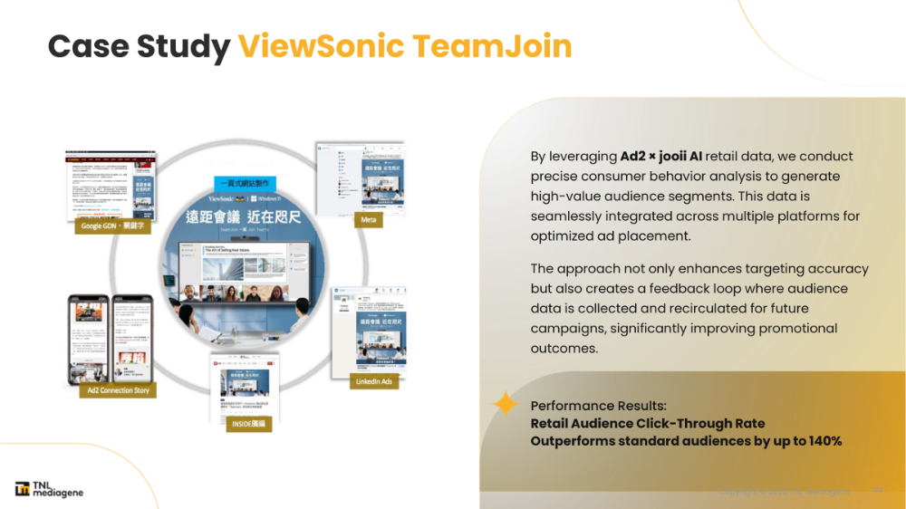 Case Study ViewSonic TeamJoin By leveraging Ad2 ð jooii AI retail data, we conduct precise consumer behavior analysis to generate high - value audience segments. This data is seamlessly integrated across multiple platforms for optimized ad placement. The approach not only enhances targeting accuracy but also creates a feedback loop where audience data is collected and recirculated for future campaigns, significantly improving promotional outcomes. Performance Results: Retail Audience Click - Through Rate Outperforms standard audiences by up to 140% 44 Copyright © 2 0 2 5 4 TNL Mediagene