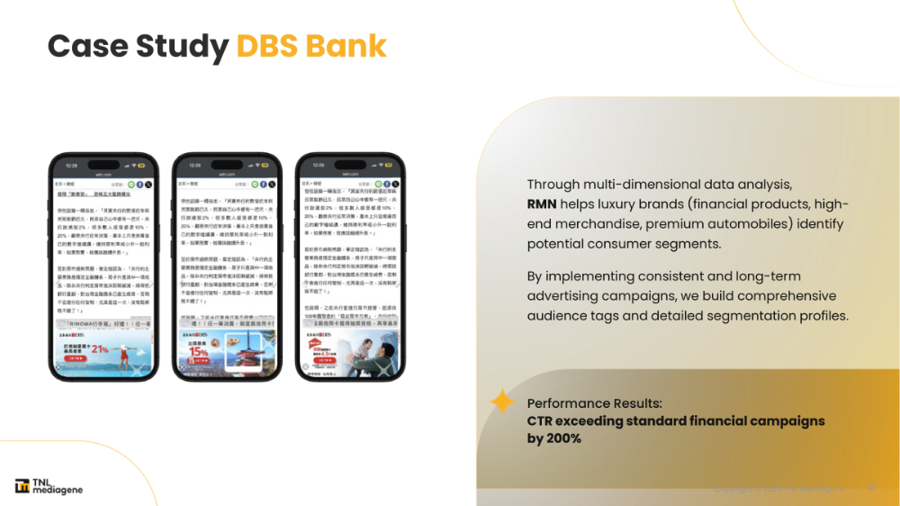 Case Study DBS Bank Through multi - dimensional data analysis, RMN helps luxury brands (financial products, high - end merchandise, premium automobiles) identify potential consumer segments. By implementing consistent and long - term advertising campaigns, we build comprehensive audience tags and detailed segmentation profiles. Performance Results: CTR exceeding standard financial campaigns by 200% 45 Copyright © 2 0 2 5 4 TNL Mediagene