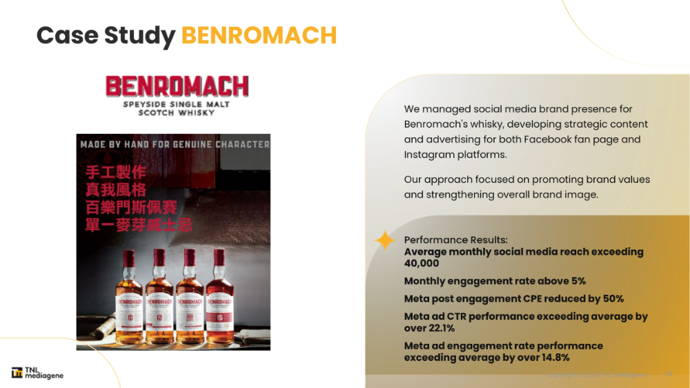 Case Study BENROMACH We managed social media brand presence for Benromach's whisky, developing strategic content and advertising for both Facebook fan page and Instagram platforms. Our approach focused on promoting brand values and strengthening overall brand image. Performance Results: Average monthly social media reach exceeding 40,000 Monthly engagement rate above 5% Meta post engagement CPE reduced by 50% Meta ad CTR performance exceeding average by over 22.1% Meta ad engagement rate performance exceeding average by over 14.8% Copyright © 2025 TNL Mediagene 46 Copyright © 2025 TNL Mediagene